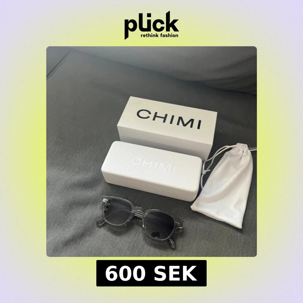 Snygga solglasögon från CHIMI med transparent svart/grå båge och runda, mörka linser. Kommer med originalfodral och tygpåse. Perfekt accessoar för att lyfta din stil och skydda ögonen mot solen.