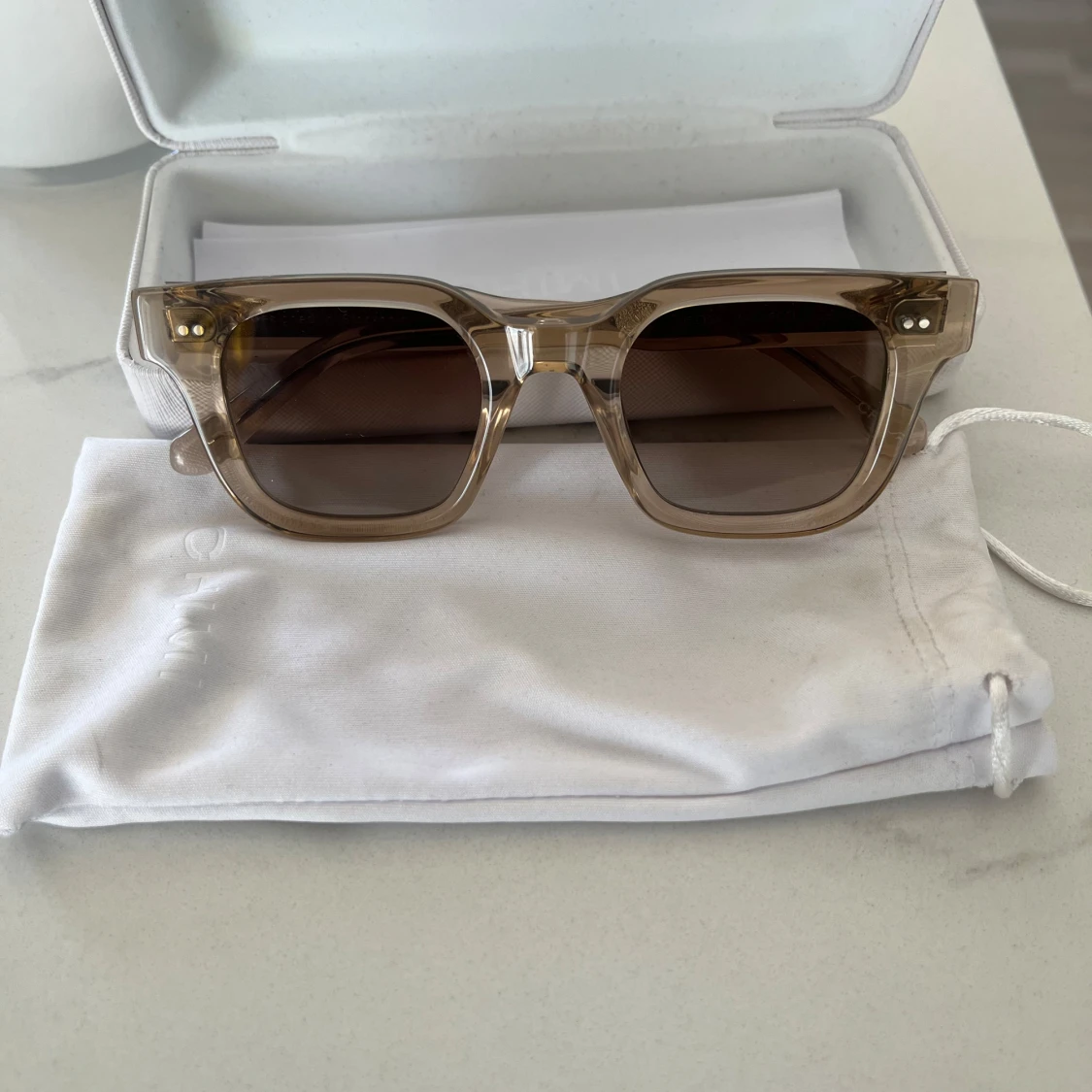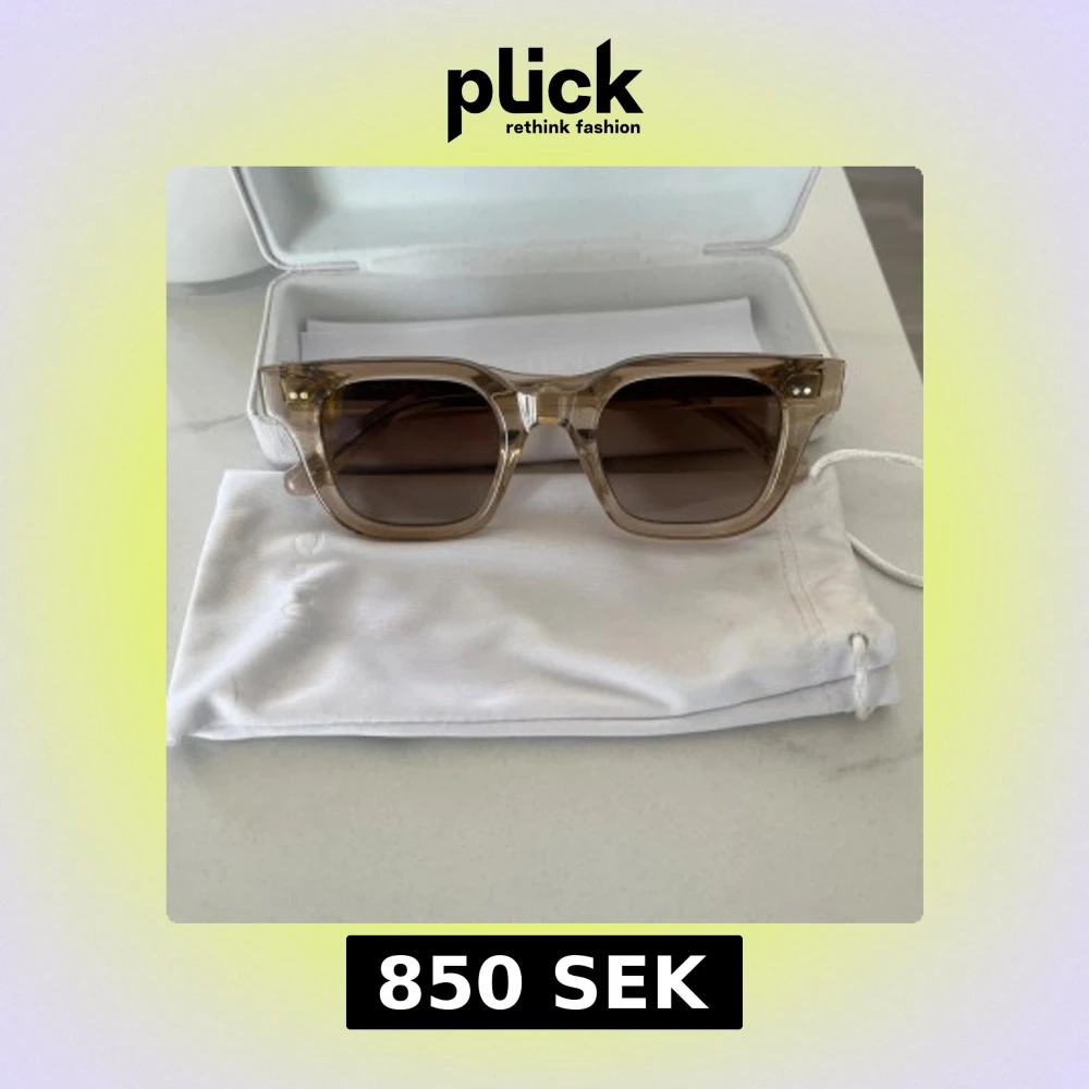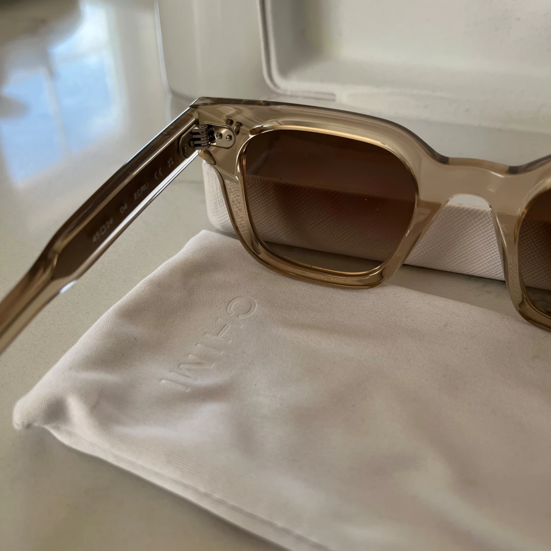 Snygga solglasögon från Chimi med transparent beige båge och fyrkantig form. Glasen är bruna och ger en cool retrovibe. Perfekta för dig som vill sticka ut med stilrena accessoarer. Kommer med originalfodral och påse. Använda 2 gånger 10/10 skick. Inte kvar kvitto för att köpet var gjort för längesedan.