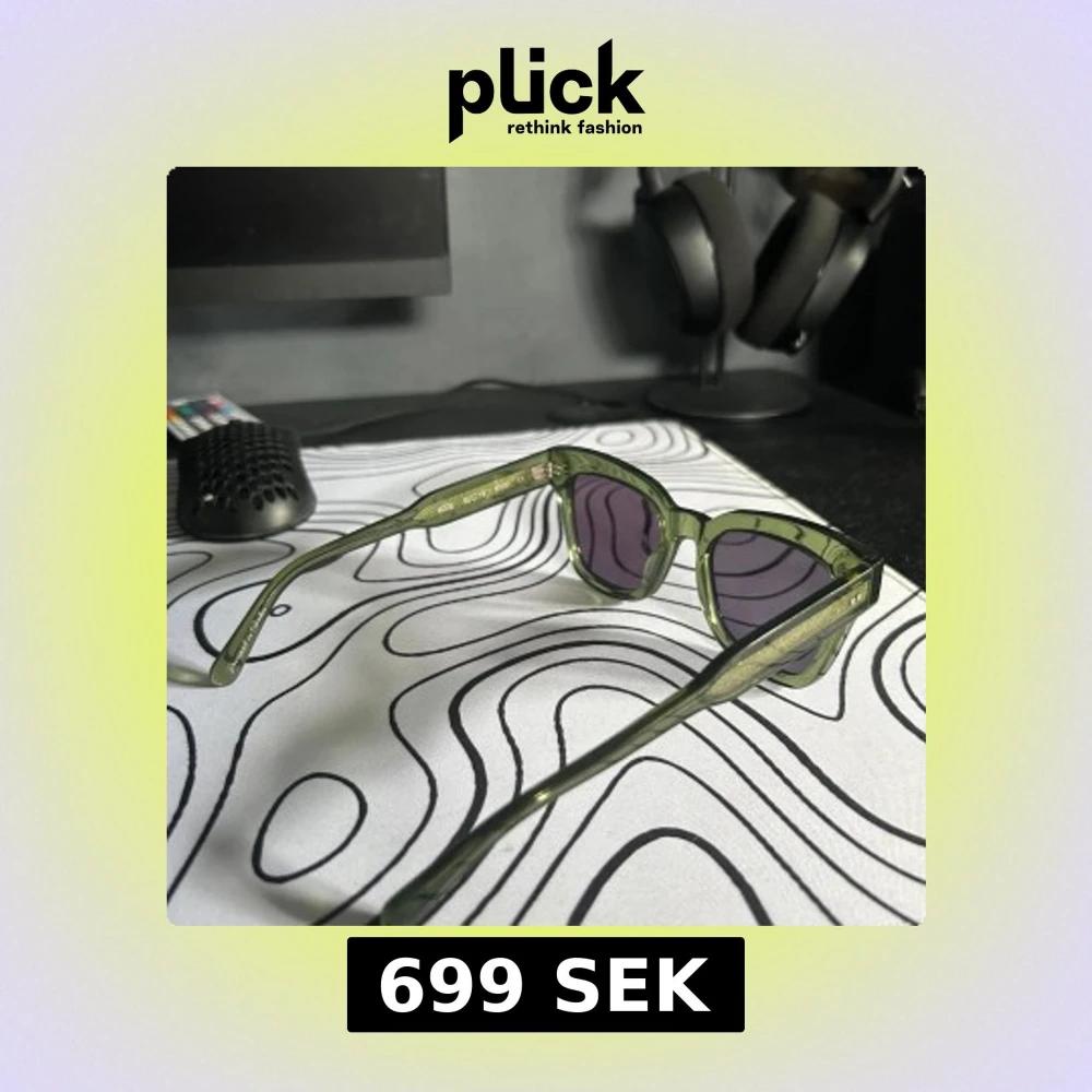 Snygga solglasögon i transparent grön plast med mörka linser. Modellen har en klassisk, något fyrkantig form och passar perfekt för dig som vill sticka ut med en cool accessoar. Märkt med #005 på insidan av skalmen. Repa på glaset