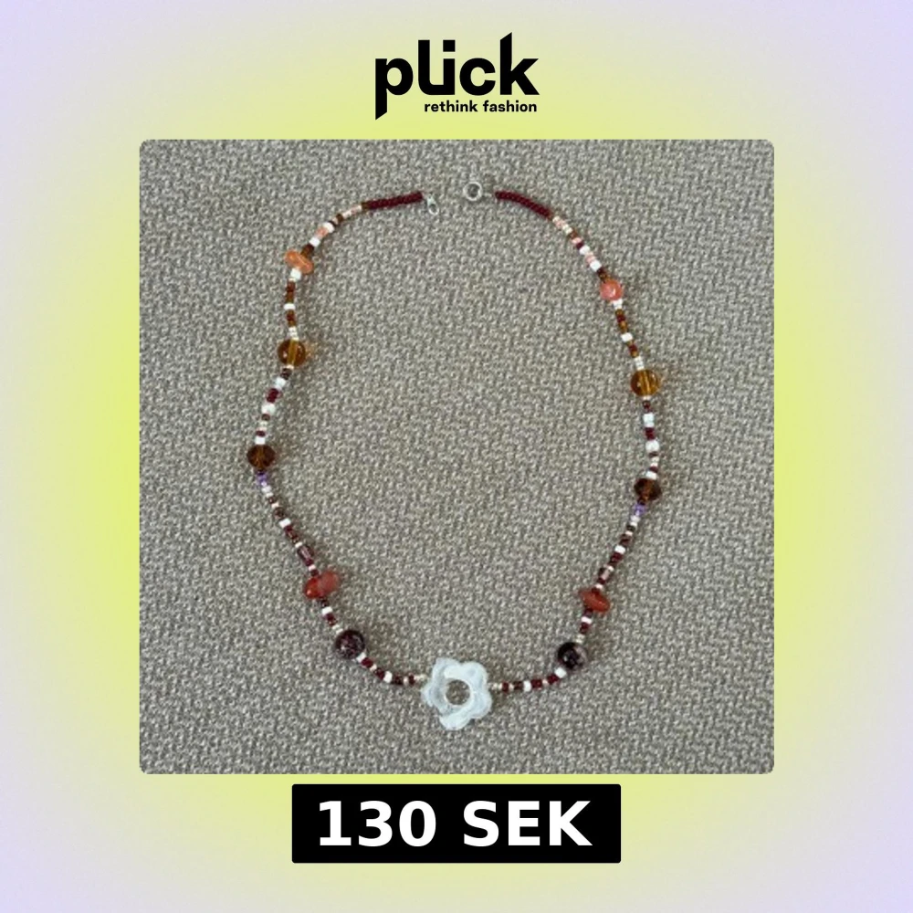 Unikt halsband med små pärlor i rött, vitt och brunt samt större glaspärlor i orange och brunt. I mitten sitter en blomformad pärla, perfekt till hösten med höstiga färger, halsbandet är 40cm långt.
