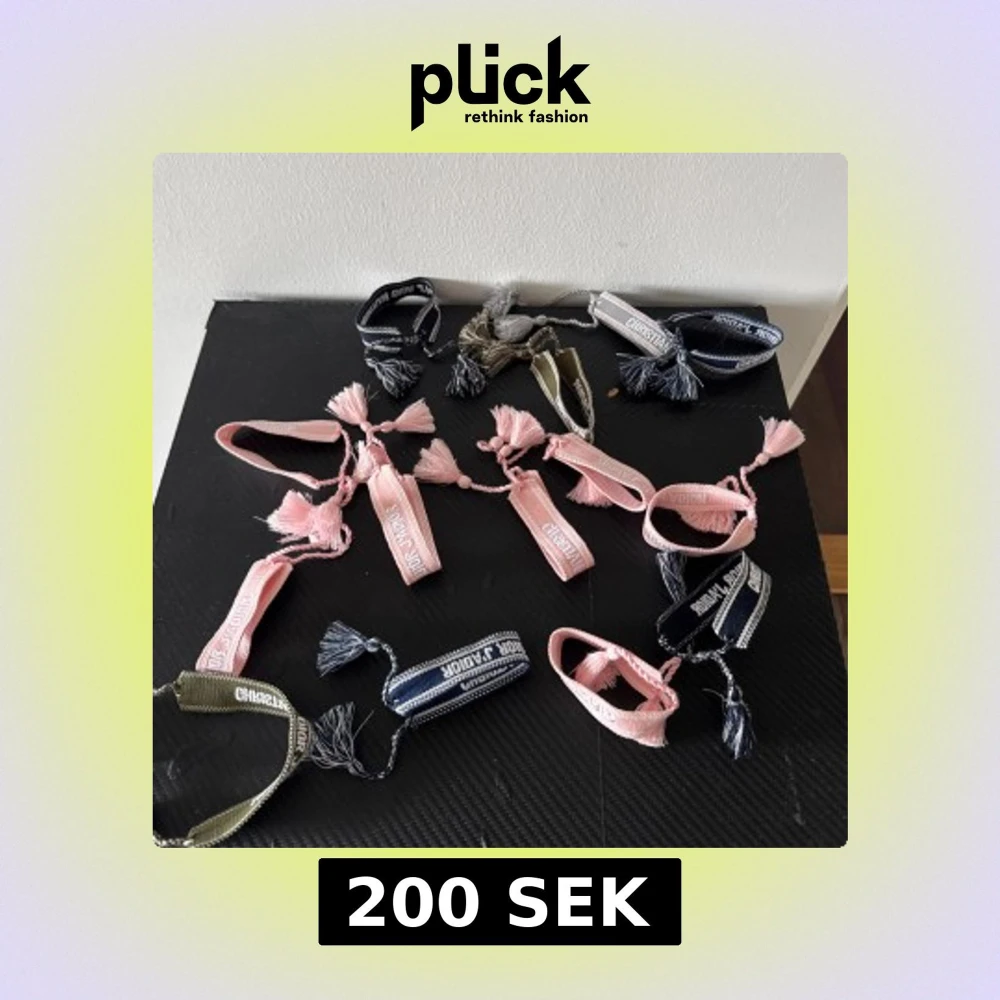 Flera snygga armband från Christian Dior i olika färger som rosa, blå, grå och olivgrön. Armbanden är vävda med tofsar i ändarna och har märkets logga broderad. Perfekt accessoar för att lyfta din outfit med en lyxig touch.