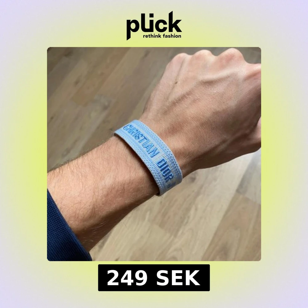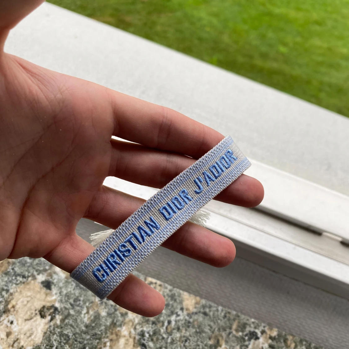Snyggt armband från Christian Dior i ljusblått tyg med texten 'CHRISTIAN DIOR J'ADIOR' broderad i blått. Armbandet har en enkel och stilren design med justerbar knytning och fransar i ändarna. Perfekt accessoar för att lyfta din outfit.