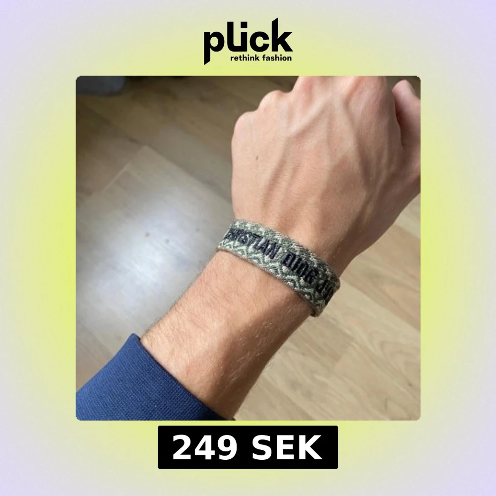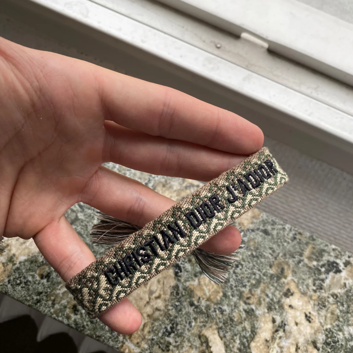 Snyggt armband från Christian Dior med texten 'J'Adior' broderad i svart. Armbandet har camouflage-mönster i beige, grönt och brunt och är gjort i ett vävt tygmaterial med fransar i ändarna. Perfekt accessoar för att lyfta din outfit.