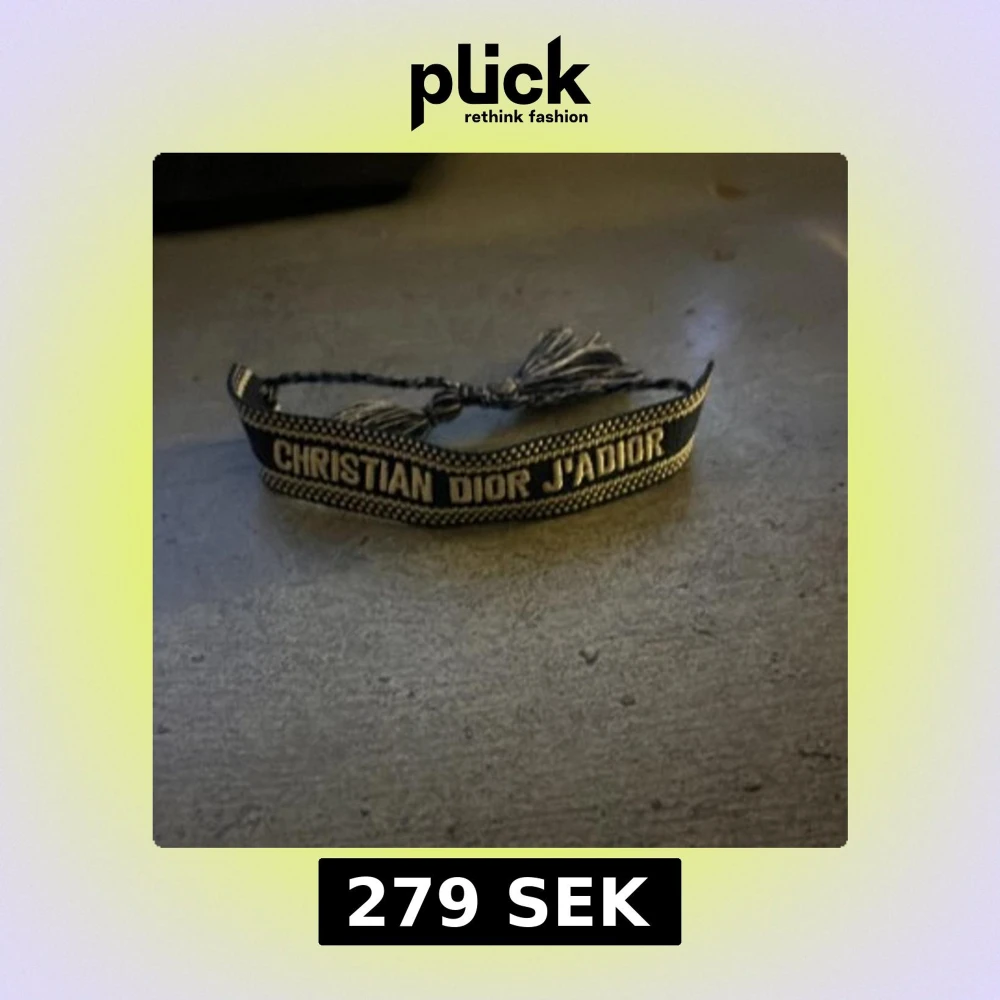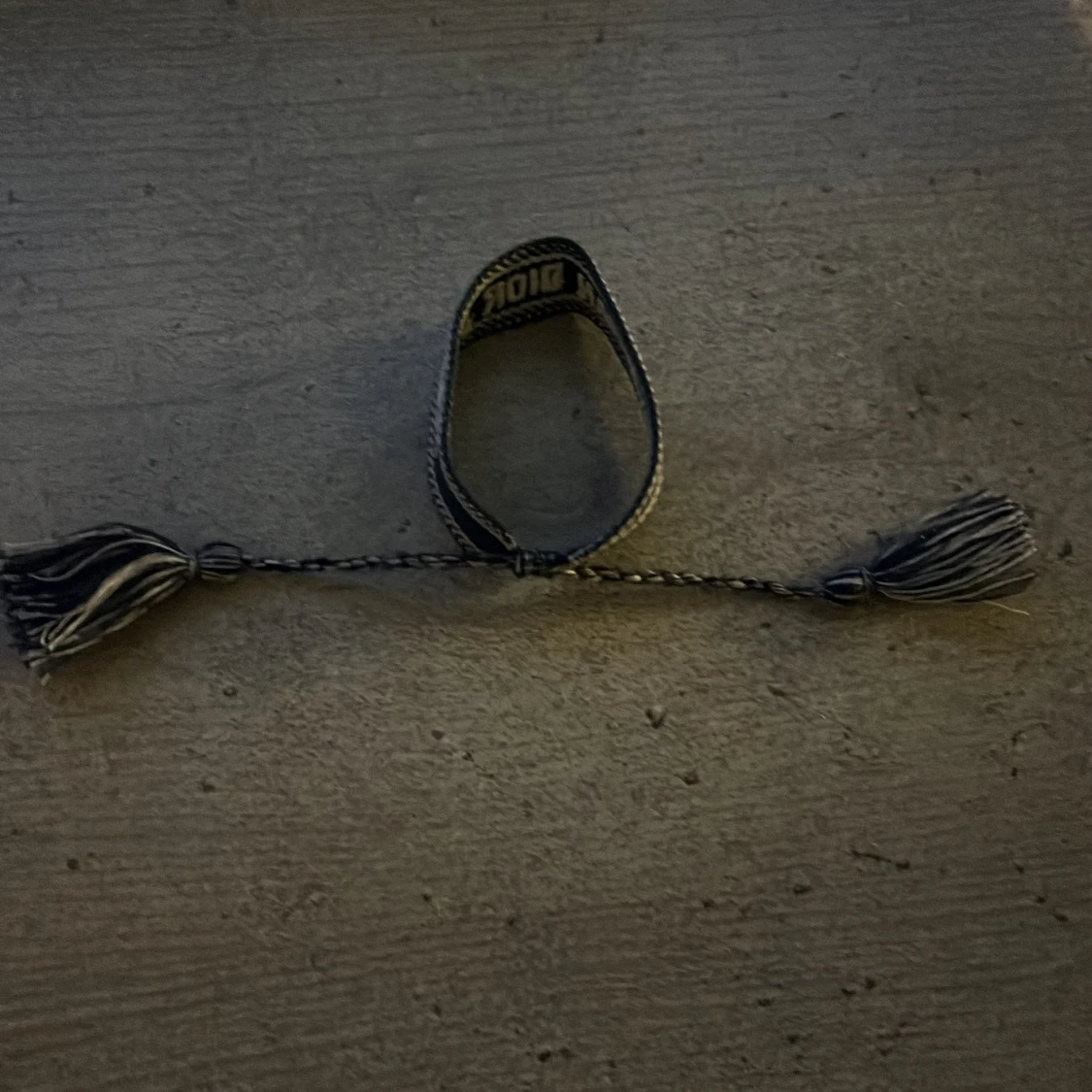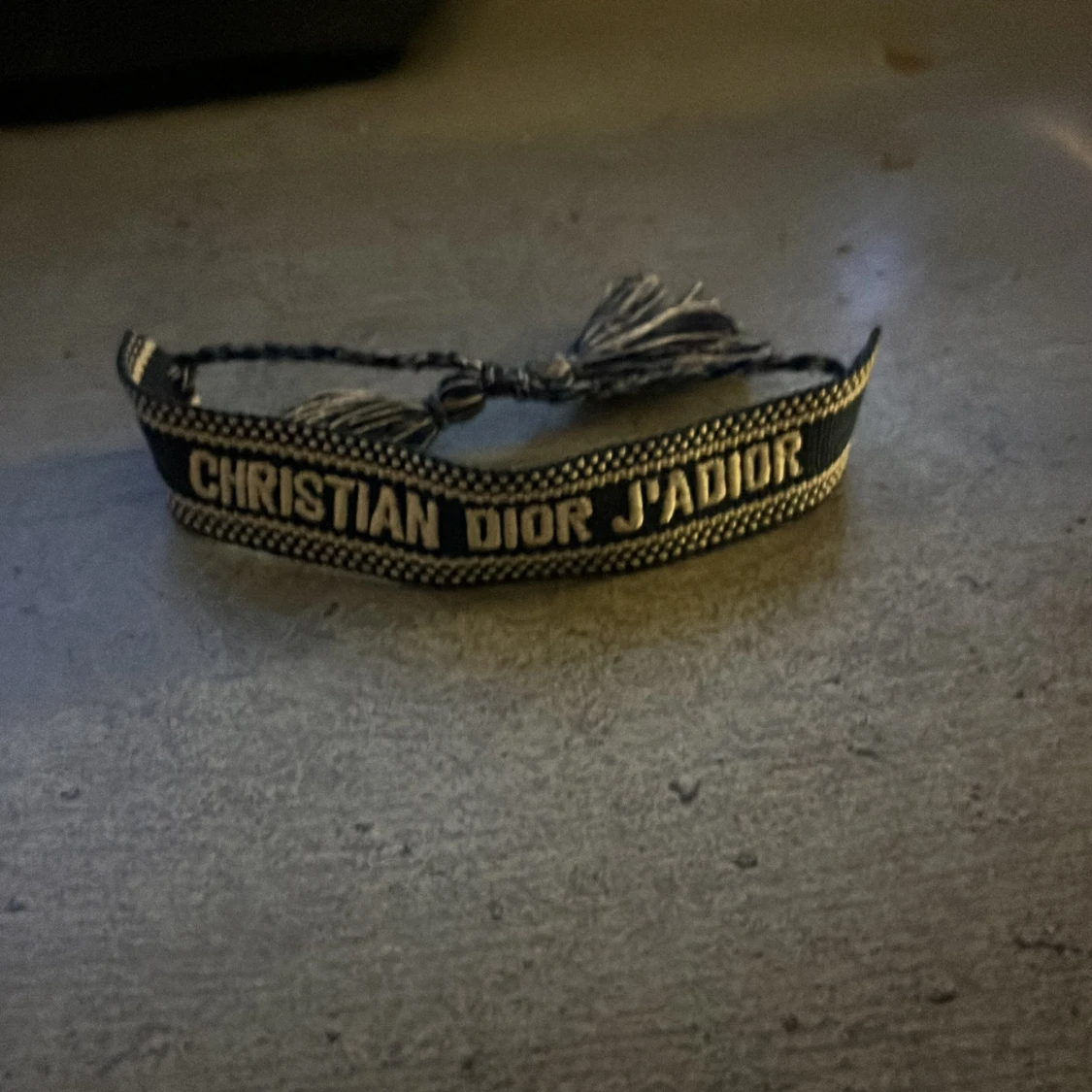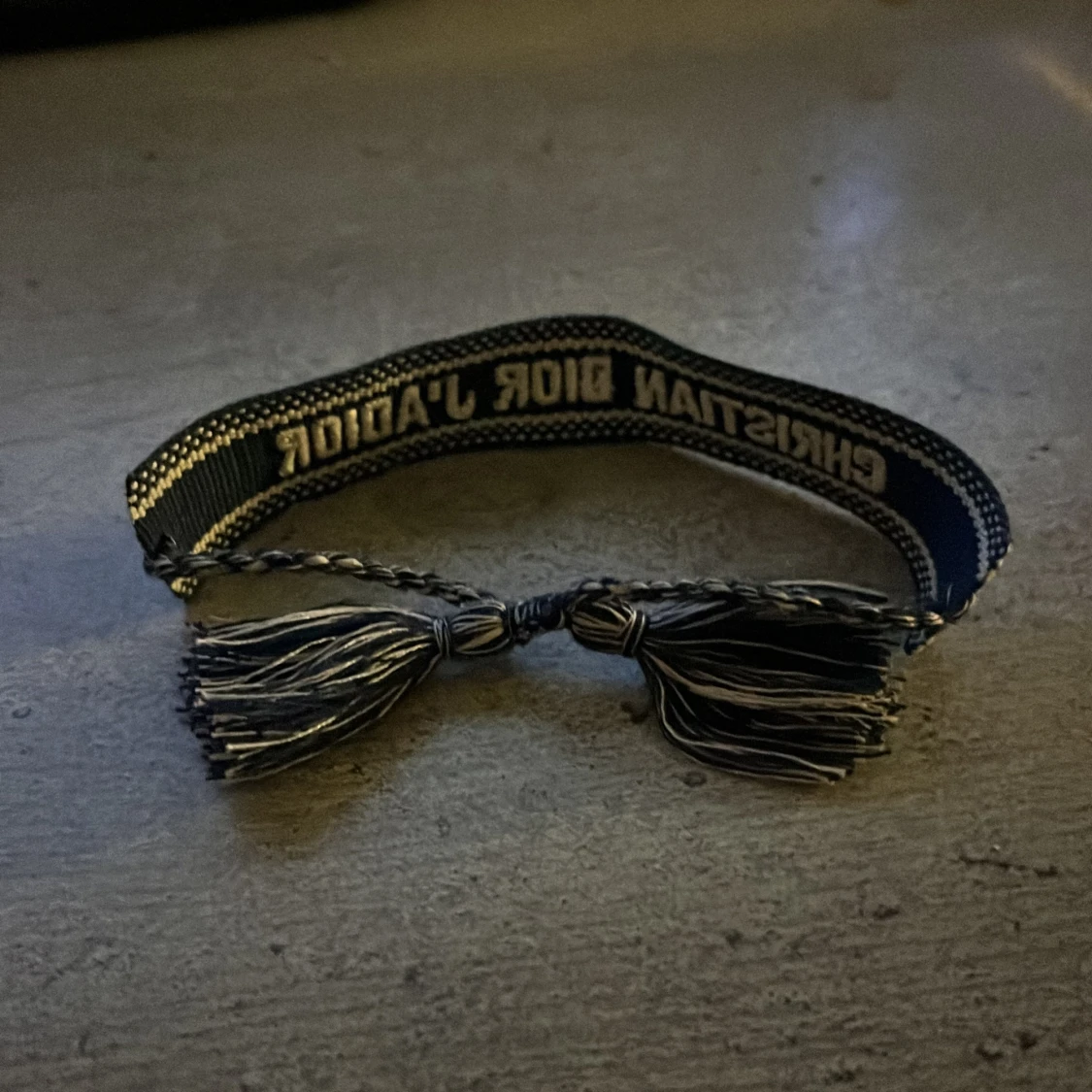 Snyggt armband från Christian Dior med texten 'J'Adior' broderad i vitt på svart tyg. Armbandet har justerbar knytning med tofsar i ändarna och en cool, bohemisk känsla. Perfekt accessoar för att lyfta din outfit med en lyxig touch.