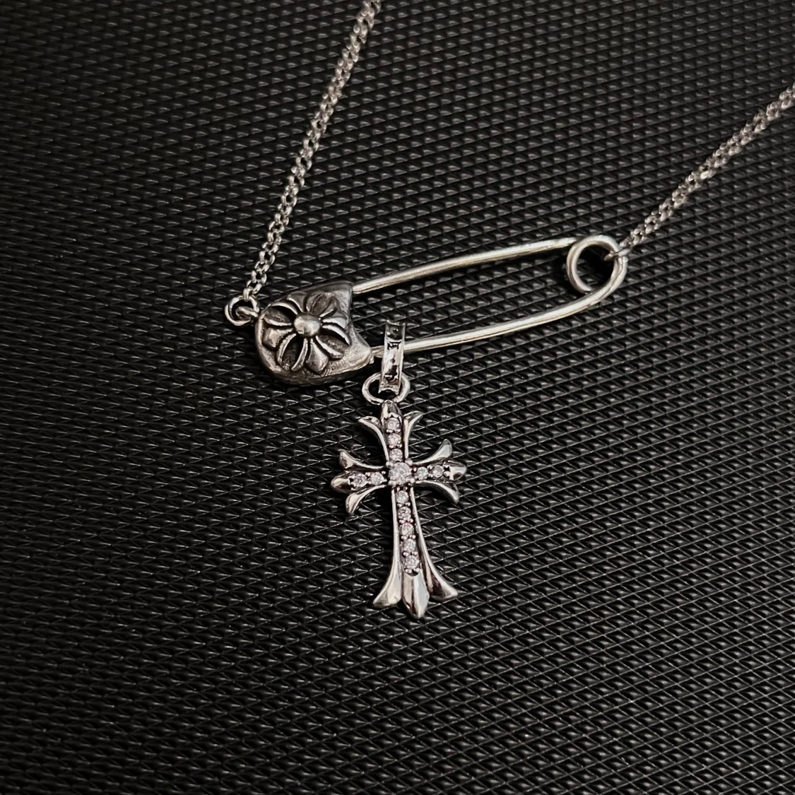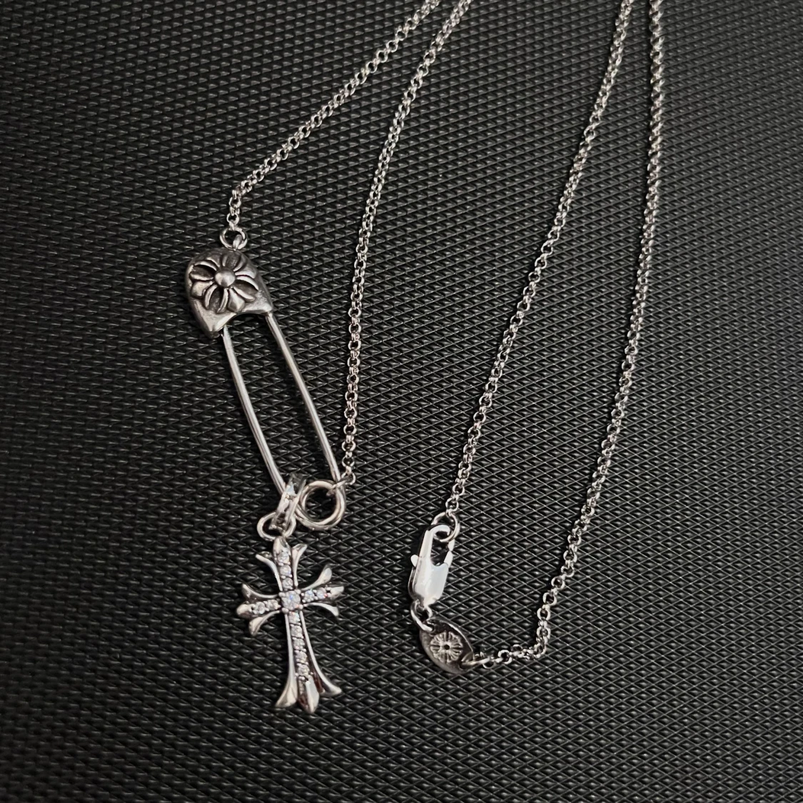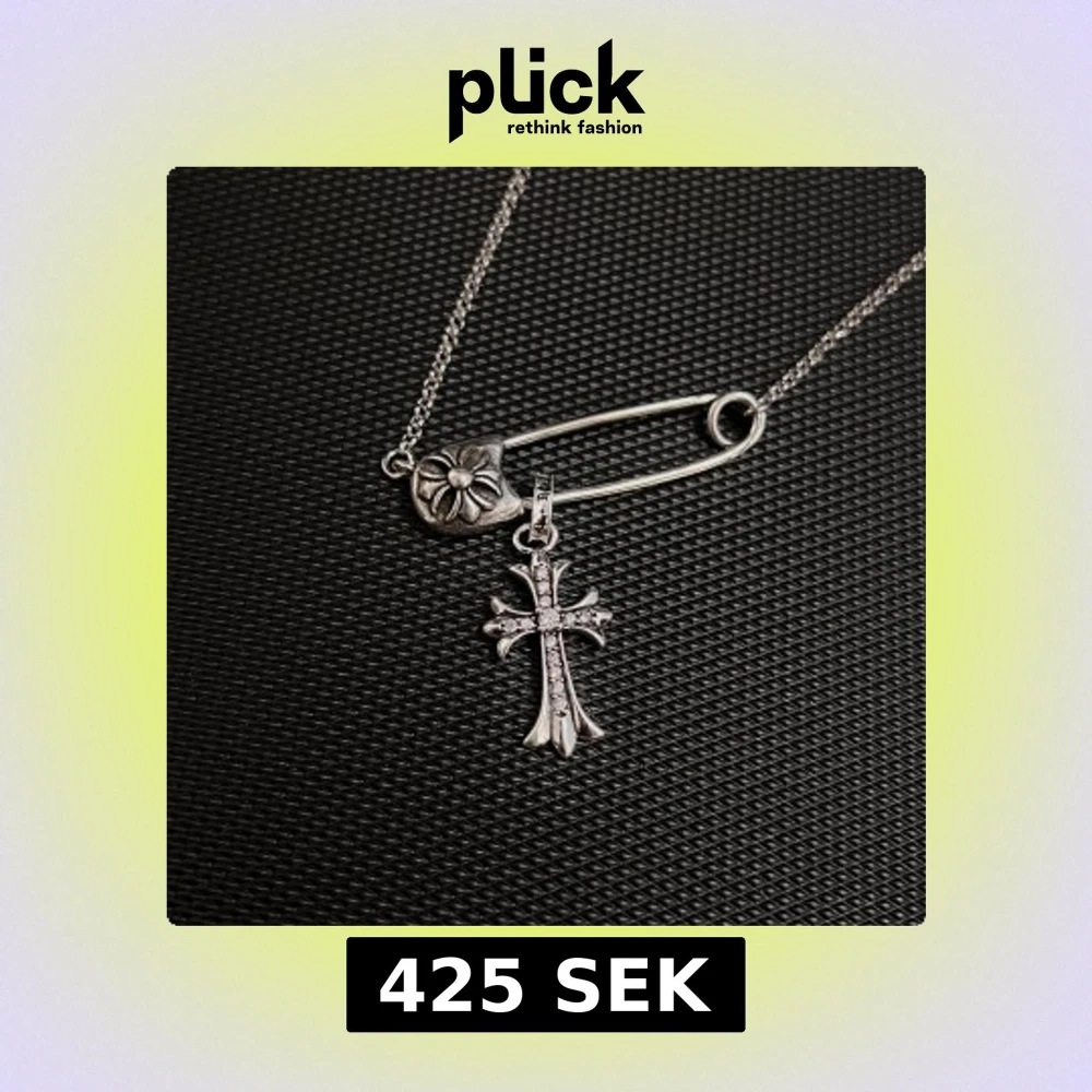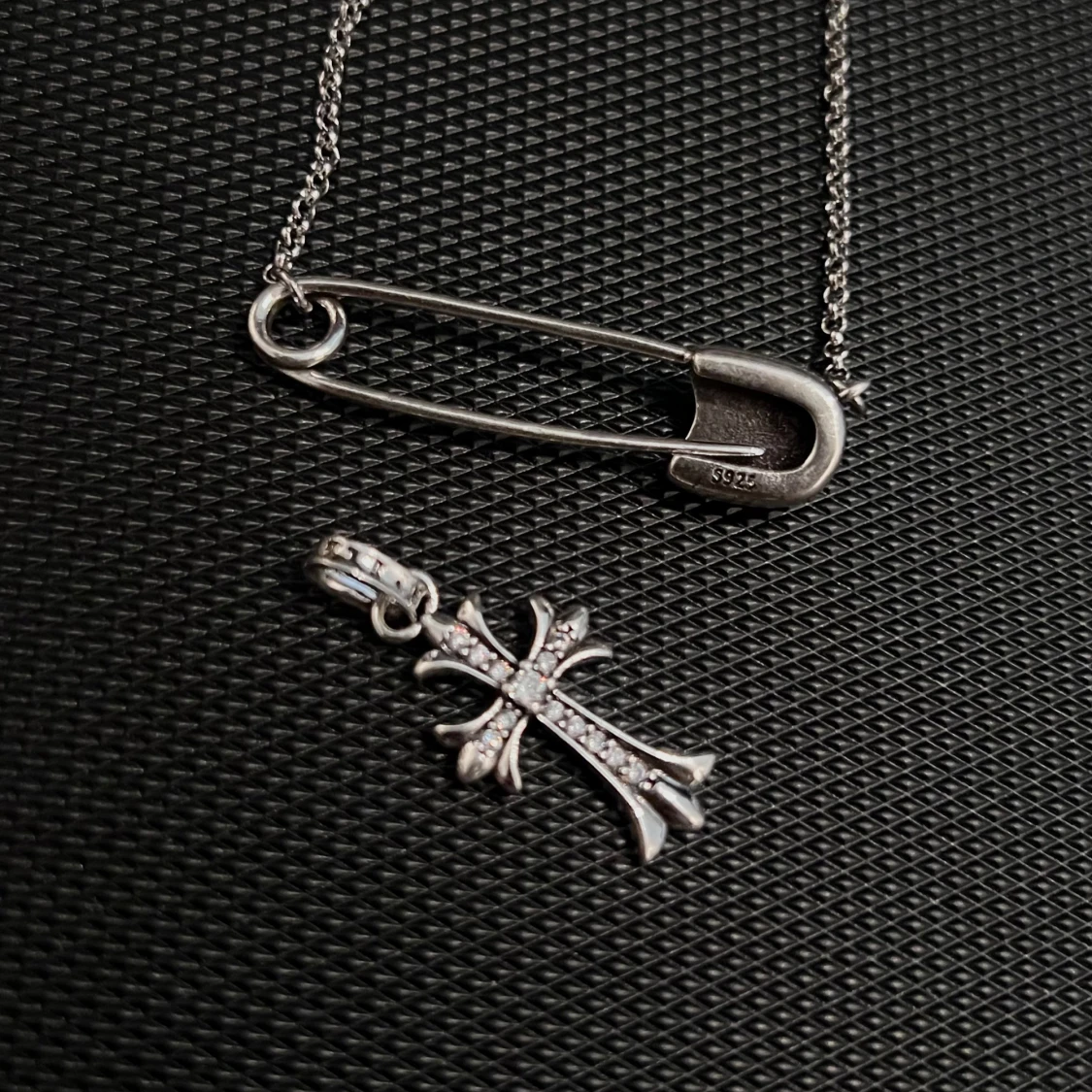 Halsband med säkerhetsnål och kors – en rebellisk silhuett i silver. Cirka 45 cm långt.