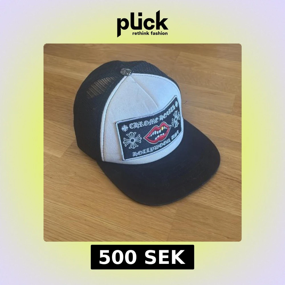 Säljer en snygg truckerkeps från Chrome Hearts med svart mesh och beige front. Kepsen har en stor broderad patch med röda läppar, vita tänder och en gul tand, samt texten 'Chrome Hearts Hollywood USA'. Metallknapp med logga på toppen. Perfekt statement piece.