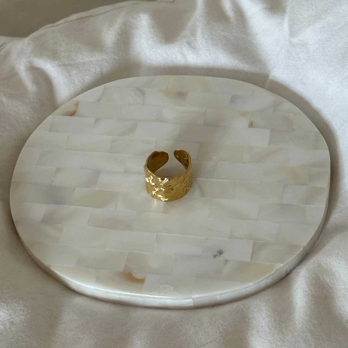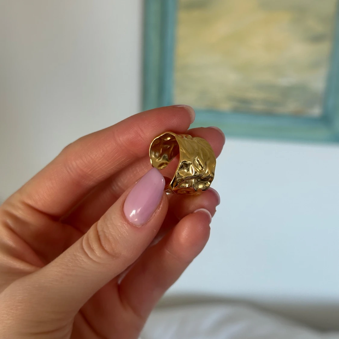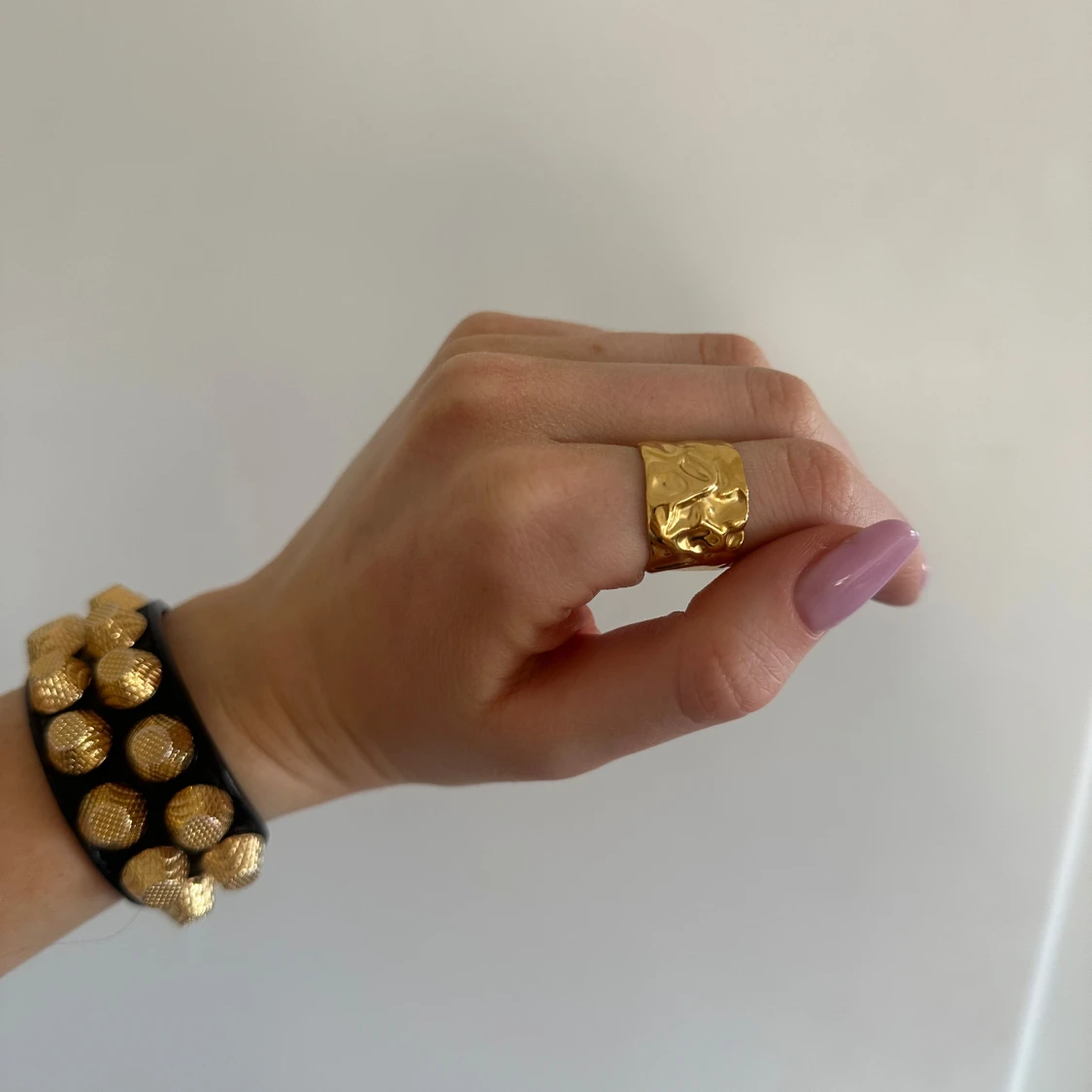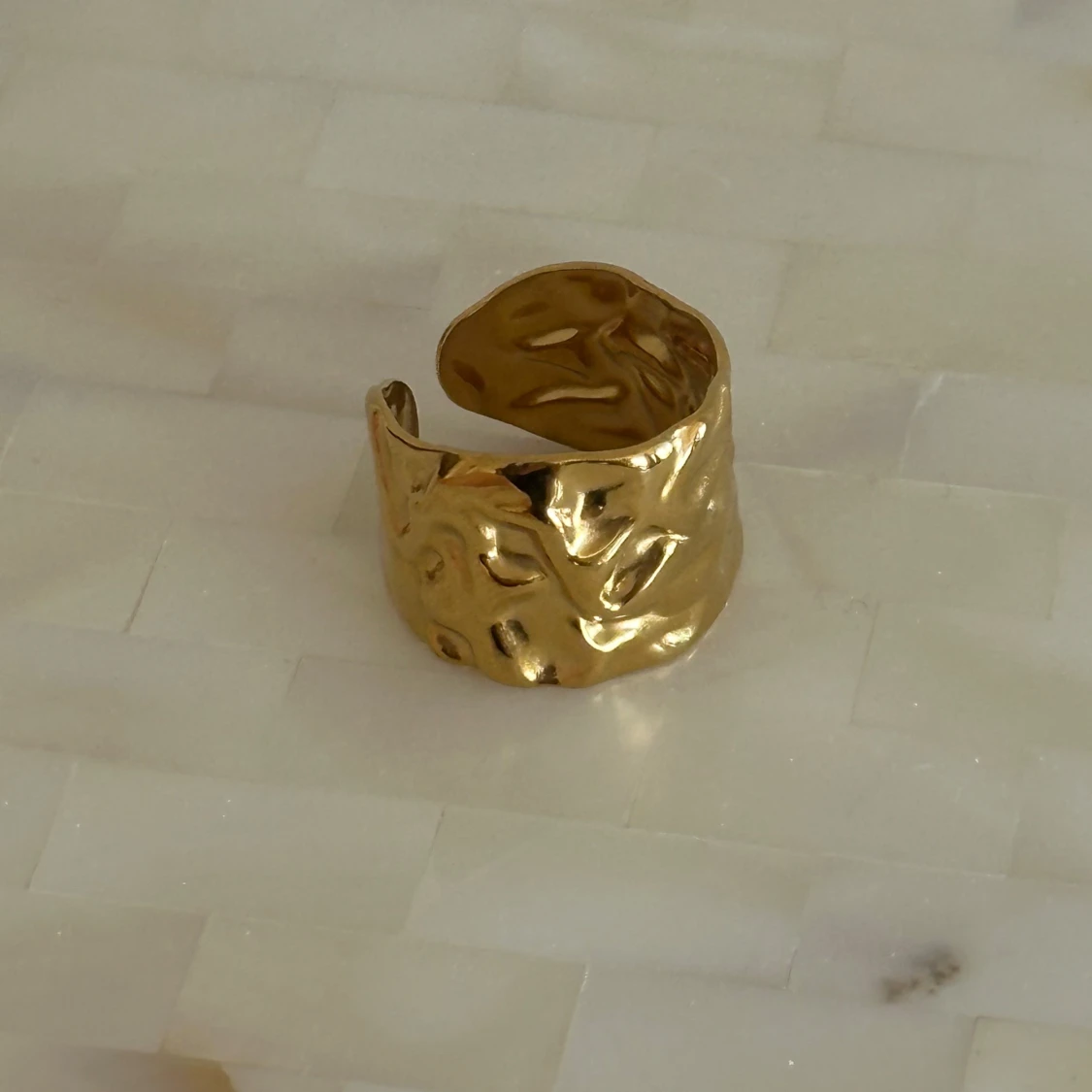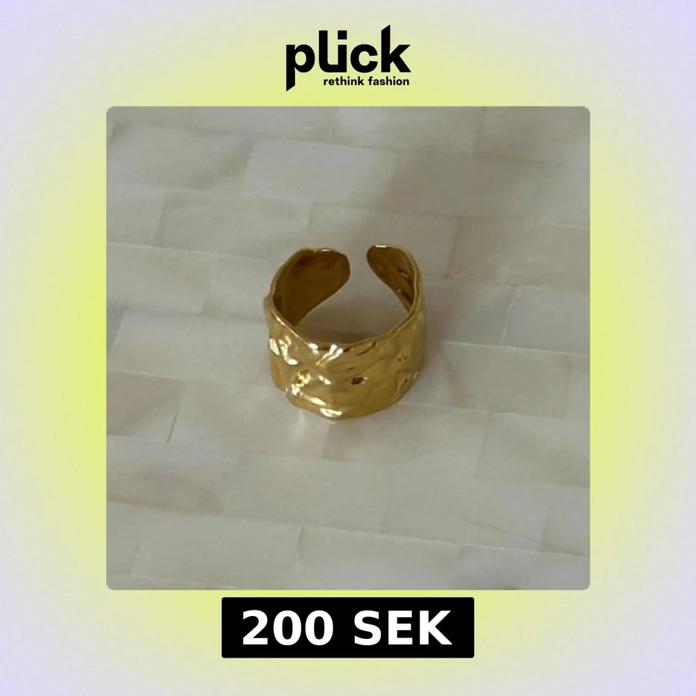Snygg guldfärgad ring med en unik, skulpterad design. Stainless steel med guldplätering. Ringen är öppen och justerbar, vilket gör den lätt att anpassa till olika storlekar. Perfekt för att ge en elegant touch till din stil🤍