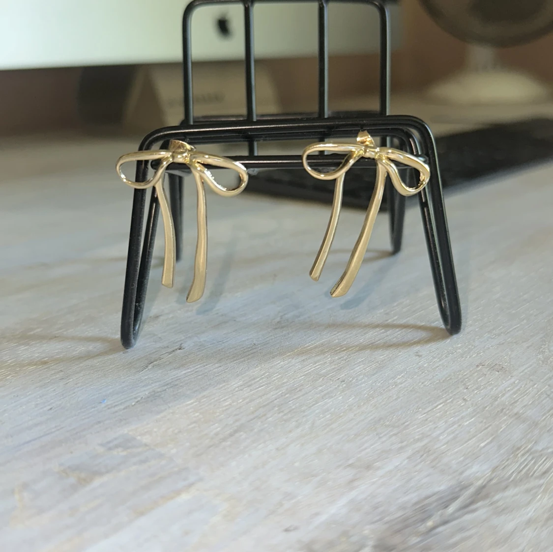 Snygga örhängen i guldmetall formade som rosetter med långa band. De har en stilren och lekfull design som verkligen sticker ut. Perfekta för dig som vill ha något unikt och trendigt i smyckeslådan.