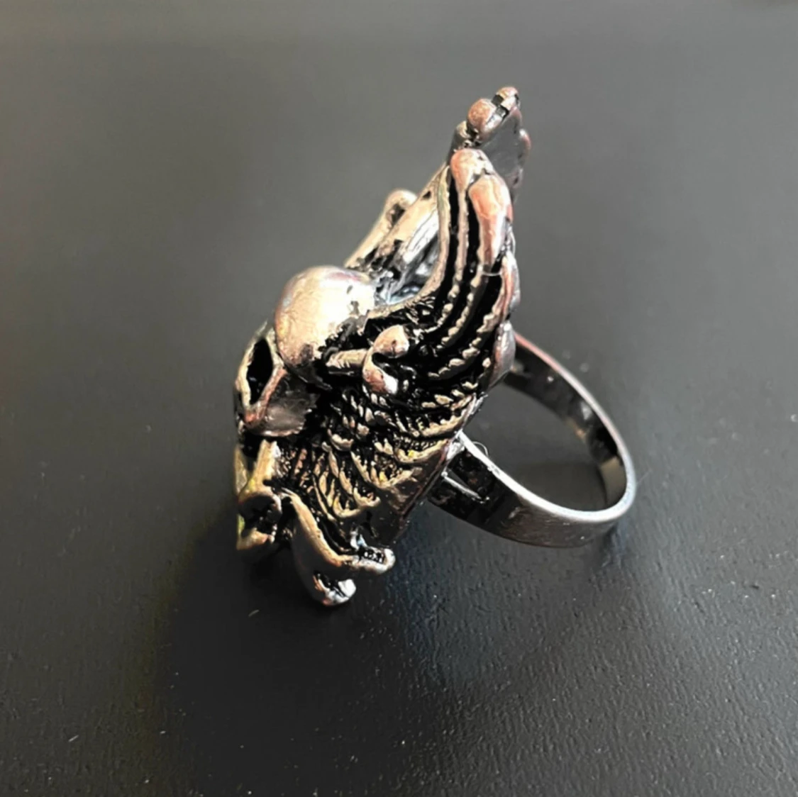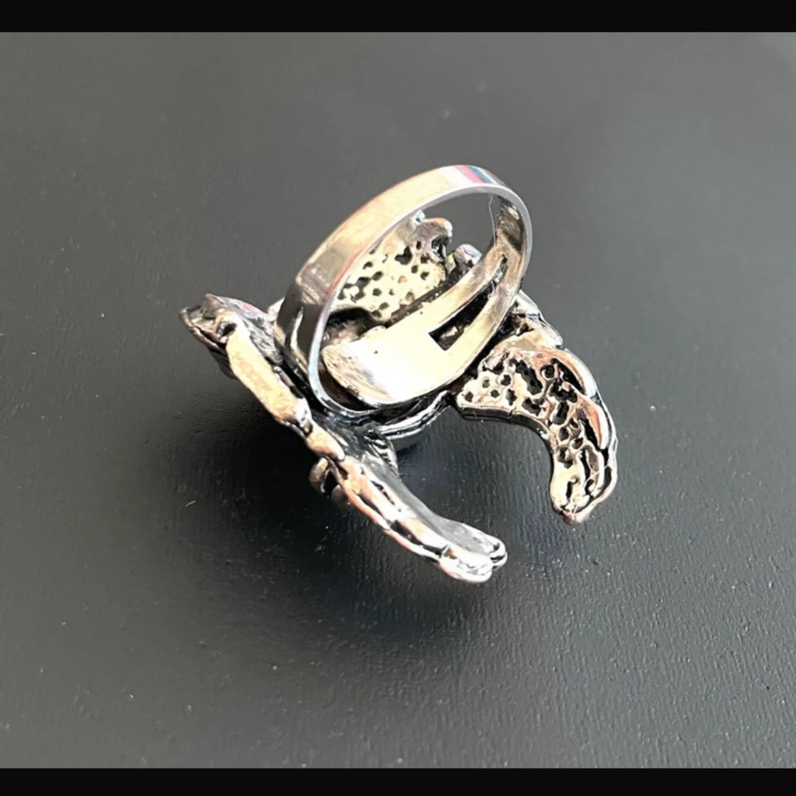 Säljer en unik och tung vintage- ring från den välkända svenska designern Carl Axel Nilsson, vars firma är känd som K.A.N. Design.Ringen är tillverkad av silverpläterad metall och tillverkades någon gång mellan 1960-1980-tal. Mått: Höjd (ornament( 3,5 cm B (ornament) 2,5 cm Vikt 19, 2 gram metal