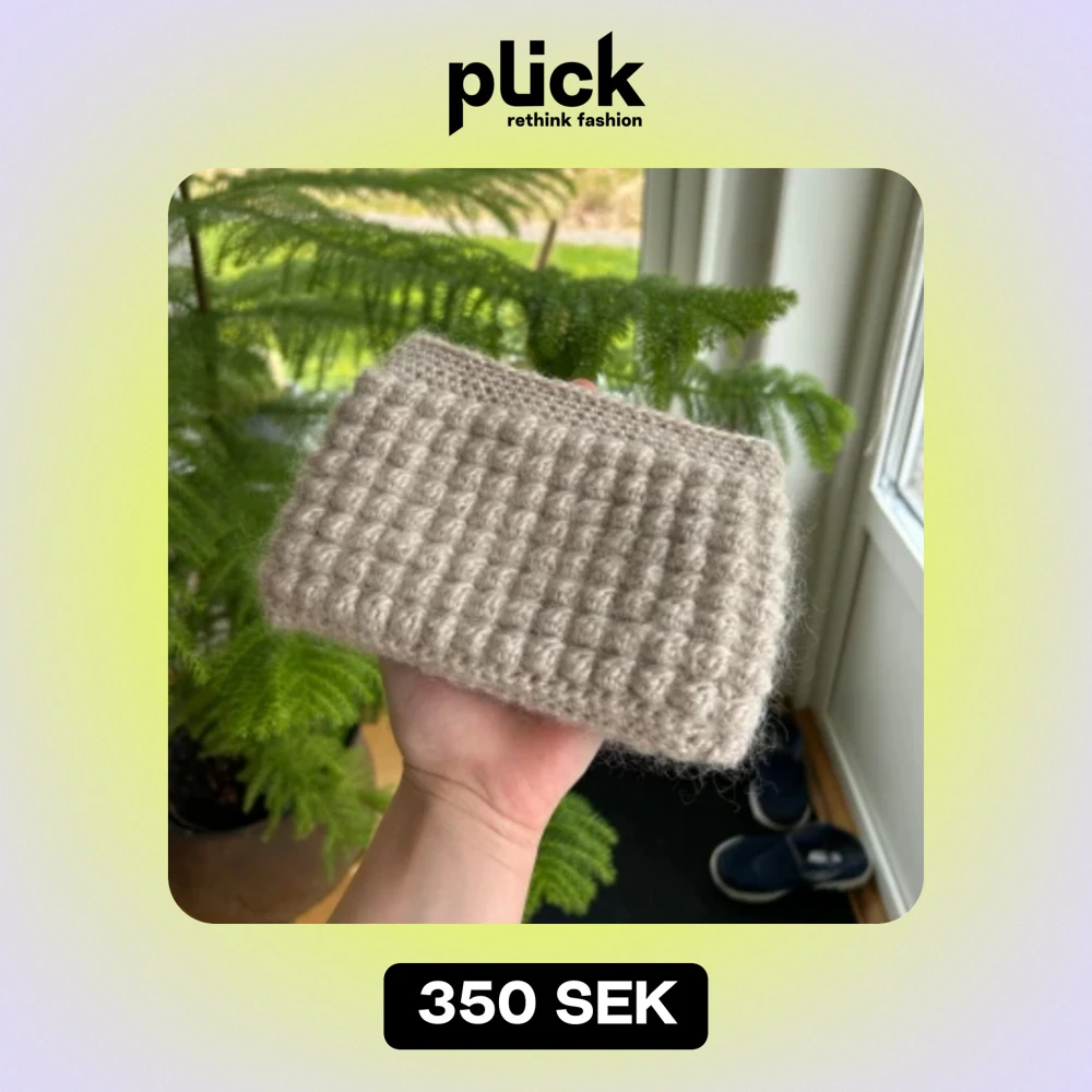 Virkad necessär gjord av mig<3 Beige garn med beige och blått innertyg. Önskas fler bilder eller har du några frågor, är bara att skicka!💕 Gjord av mohair och bomullsgarn, ca 11 hög och 16cm bred.
