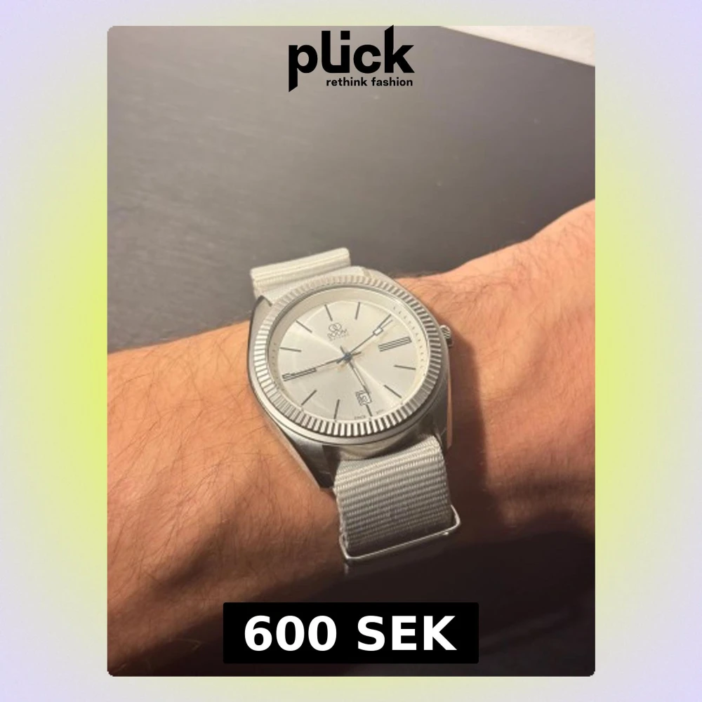 Bilderna visar en silverfärgad klocka från BOOM Watches med ljusgrått textilband, minimalistisk urtavla och datumvisning. Klockan är fullt fungerande och i nytt skick. 40mm