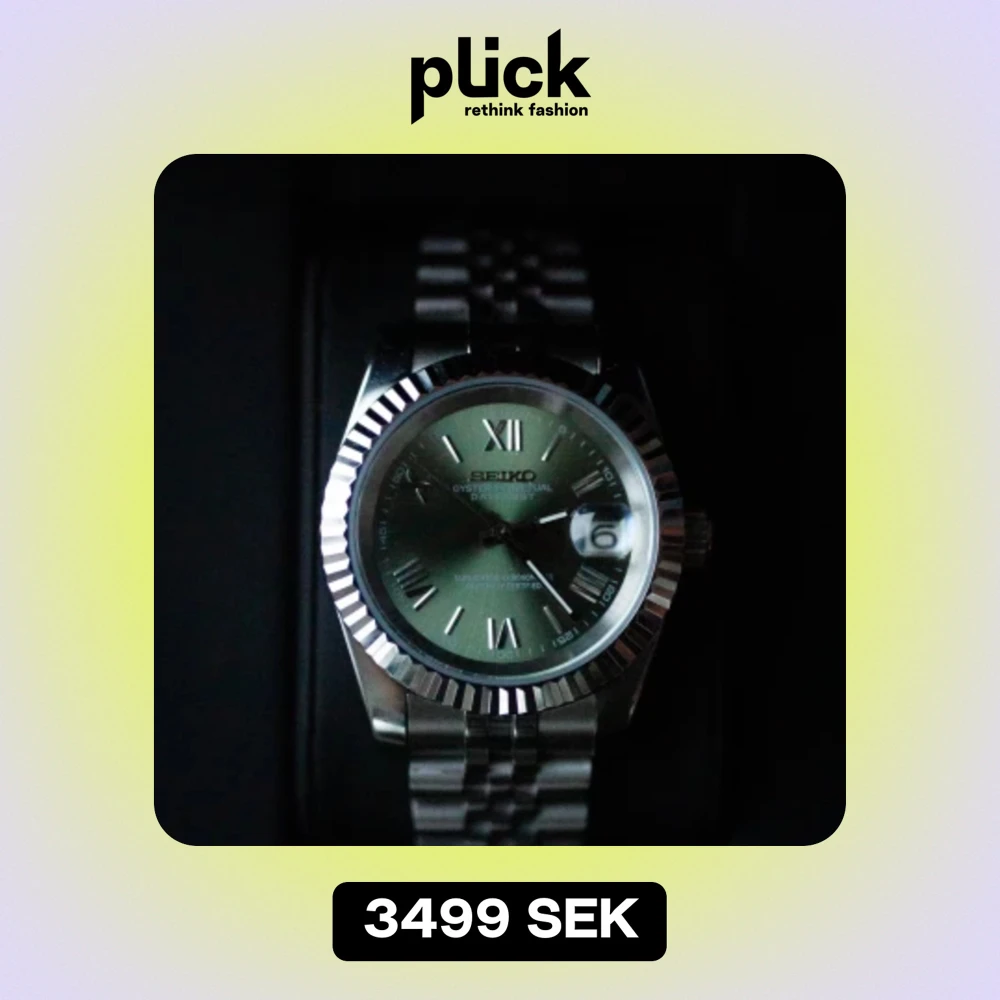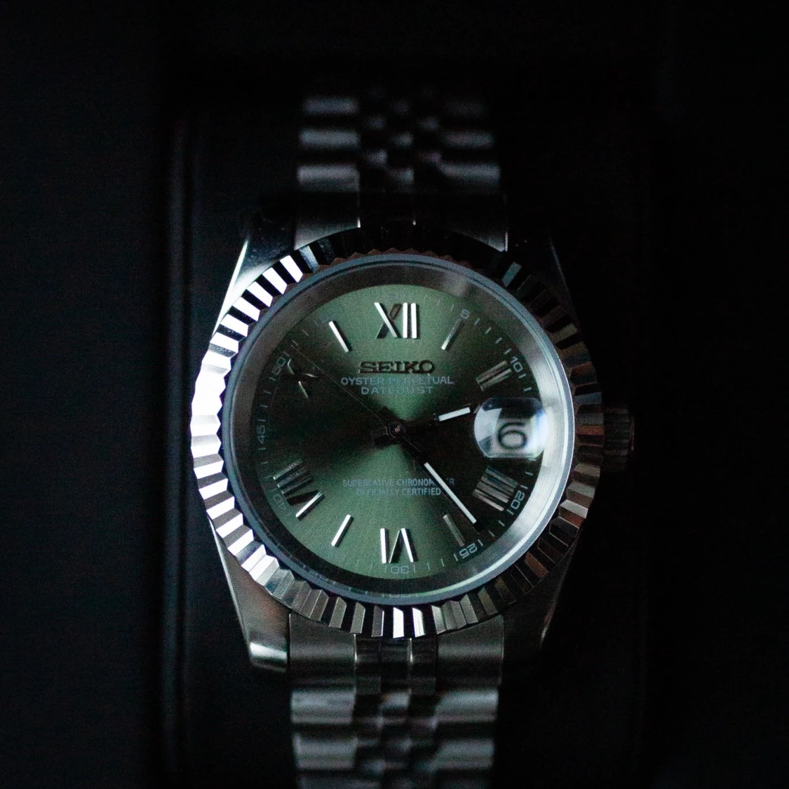 Egen gjord Seiko mod med NH35-A urverk som går på kinetiskenergi. Grön urtavla, jubilee band, förstoringsglas etc.