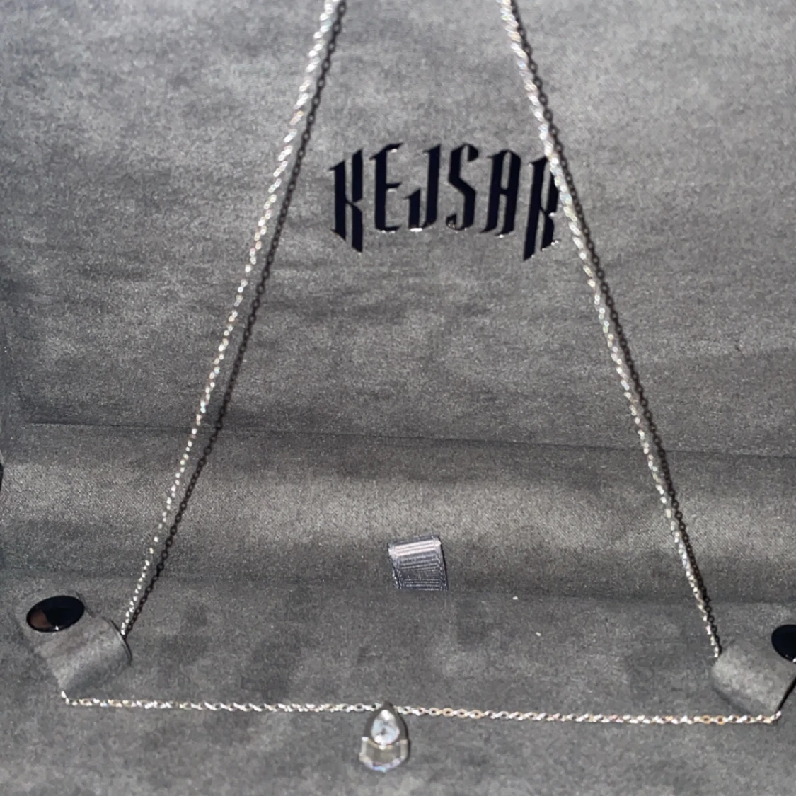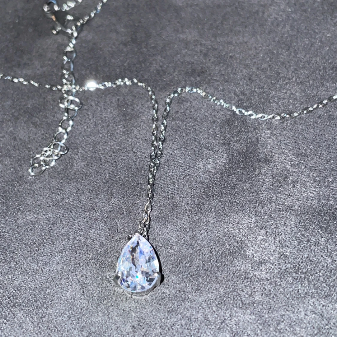 Elegant silverhalsband från Kejsar med en gnistrande droppformad kristall. Perfekt för att lägga till en touch av glamour till din outfit. Kedjan är tunn och smidig, vilket gör den bekväm att bära.
