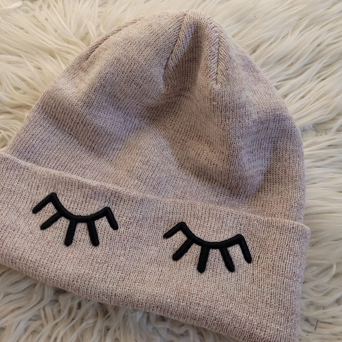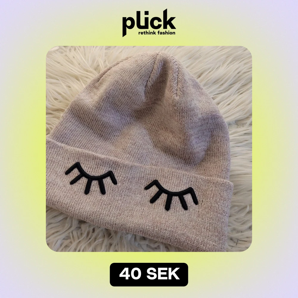 Superfin rosa mössa från H&M Divided med söta broderade ögonfransar framtill. Perfekt för att hålla sig varm och stilig under kyliga dagar. Den är stickad och har en mjuk och bekväm passform. Passar perfekt till både vardag och lite mer avslappnade tillfällen.