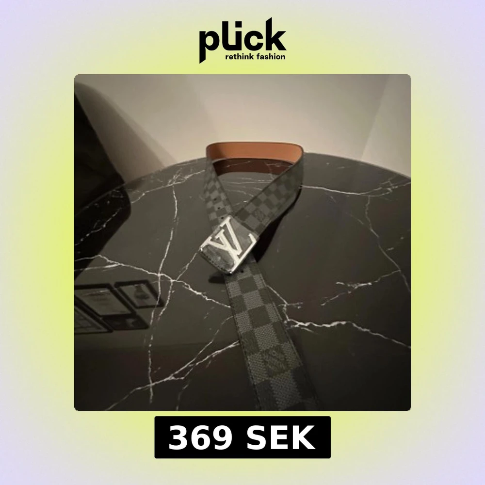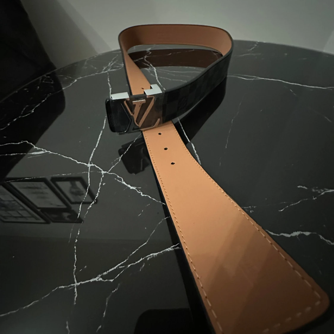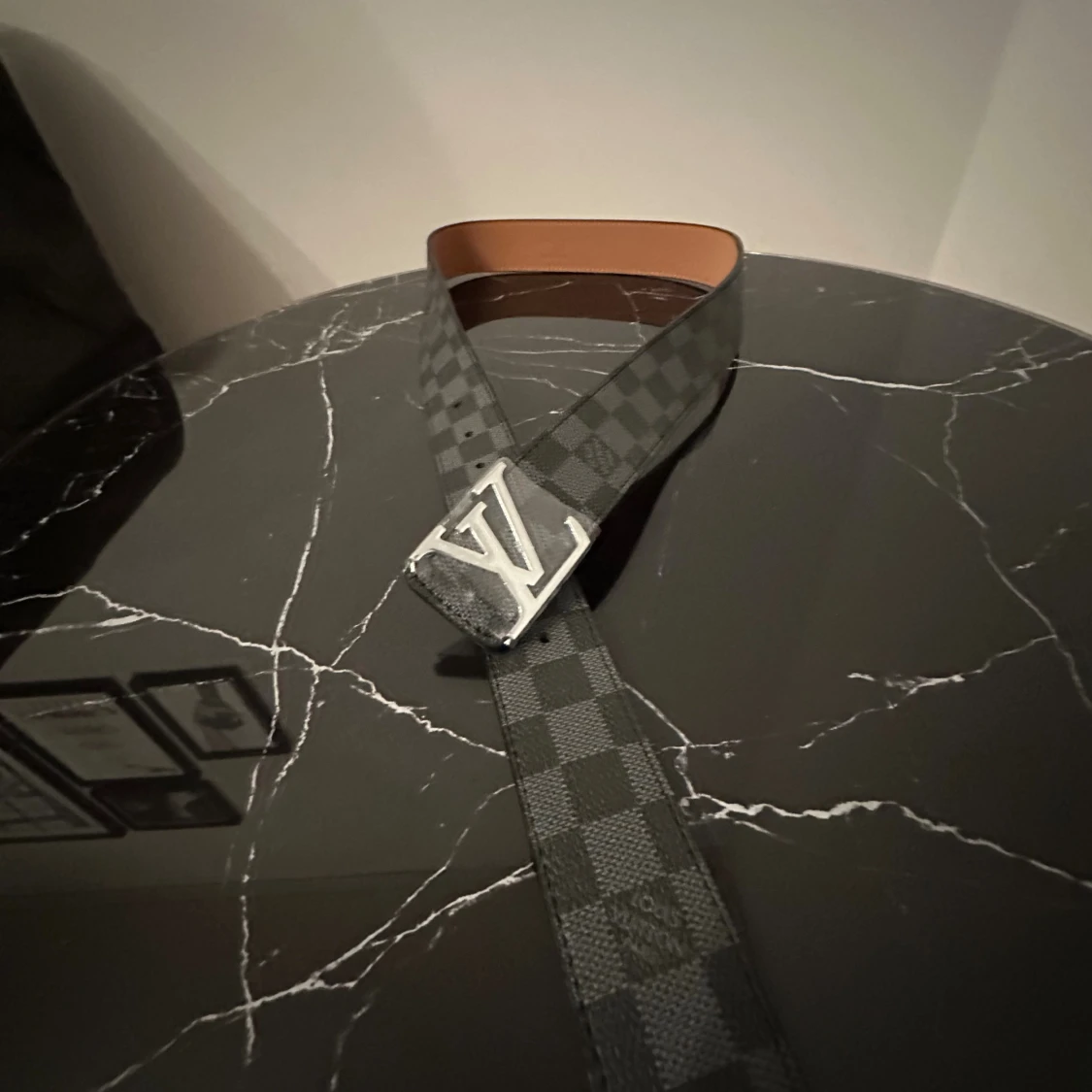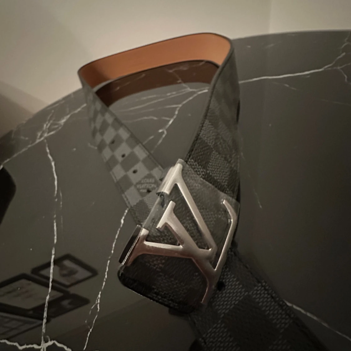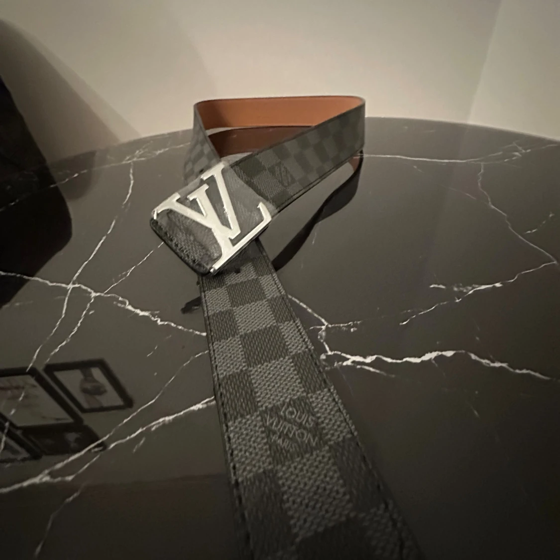 Snyggt bälte i klassiskt Damier Graphite-mönster med svart och grå ruta. Bältet har en stor silverfärgad -logga som spänne och insidan är i ljusbrunt skinn. Perfekt accessoar för att lyfta din outfit.