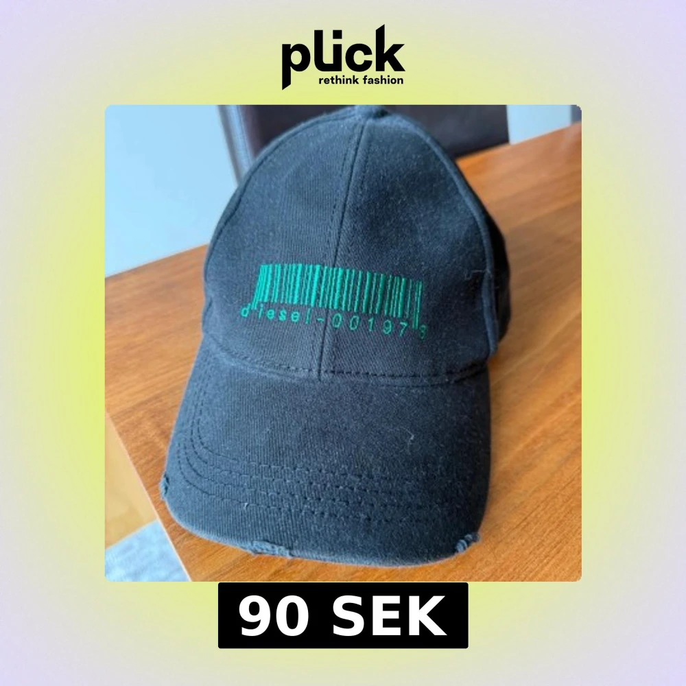 Svart keps från Diesel i bomull med justerbar snapback och cool grön brodyr framtill som föreställer en streckkod och texten 'diesel-001973'. Klassisk böjd skärm och diskret Diesel-tag baktill. Slitna detaljer på skärmen.