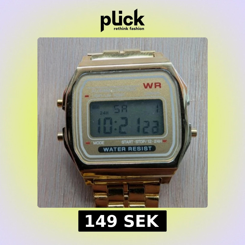 Säljer en digital retro-klocka i guldfärg med klassisk fyrkantig display och länkarmband. Klockan har digital tidvisning, alarm och stoppursfunktion. Metallarmbandet ger en cool vintagekänsla och displayen är tydlig med svart text mot grå bakgrund.