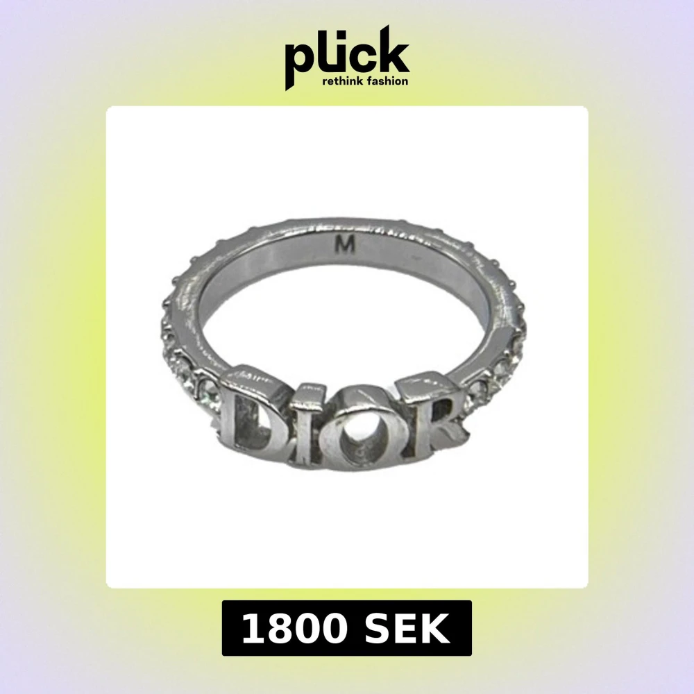 Snygg silverfärgad ring från Dior med tydlig logga framtill. Ringen är dekorerad med gnistrande stenar runt hela bandet som ger extra bling. Perfekt accessoar för dig som gillar statement-smycken och vill sticka ut. Storlek M dom är ungefär 16,5 mm.