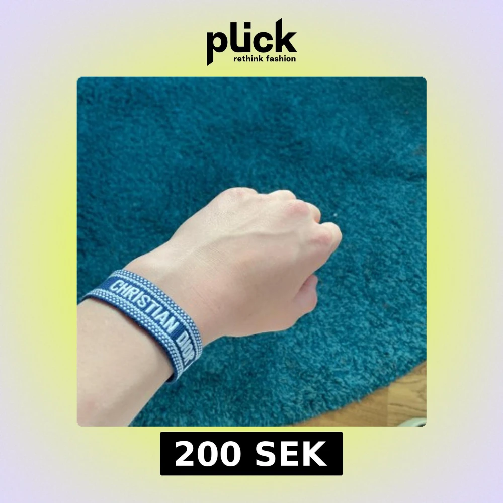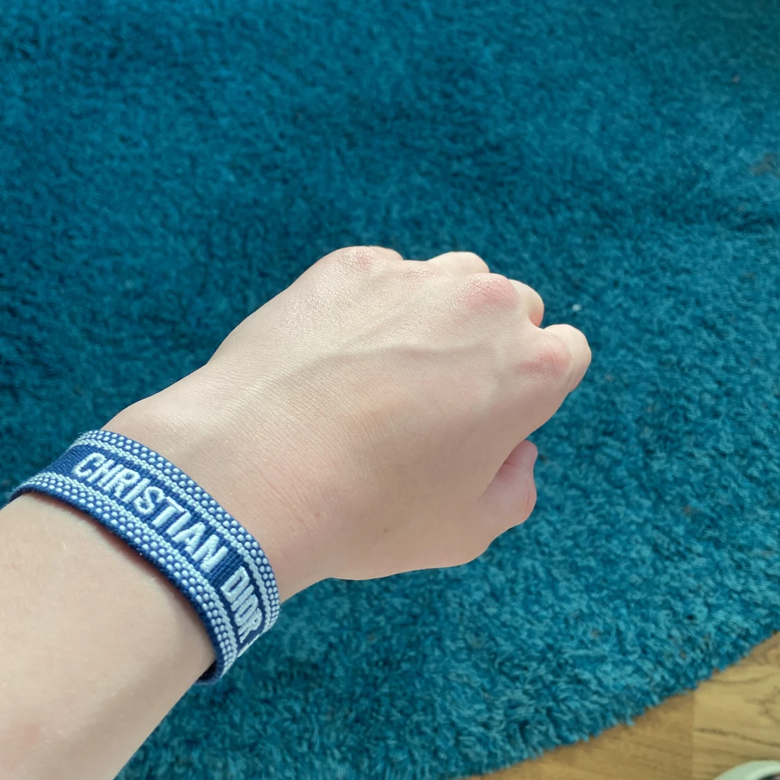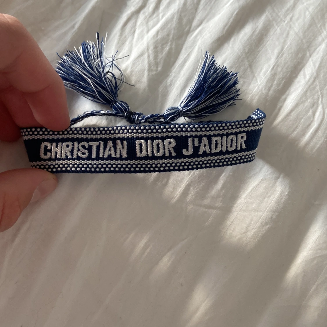 Säljer ett blått armband från Christian Dior med texten 'CHRISTIAN DIOR J'ADIOR' i vitt. Armbandet har knytning och fransar i ändarna, vilket ger en trendig och avslappnad look.