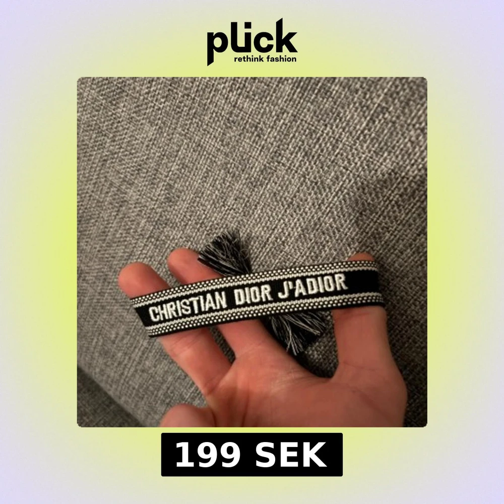 Snyggt svart och vitt armband från Christian Dior med texten 'J'Adior' broderad. Armbandet har fransar i ändarna och är perfekt för att ge din outfit en lyxig touch. Klassisk och trendig accessoar från Dior.