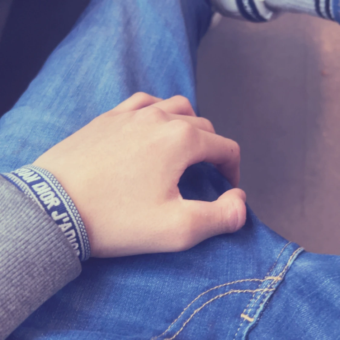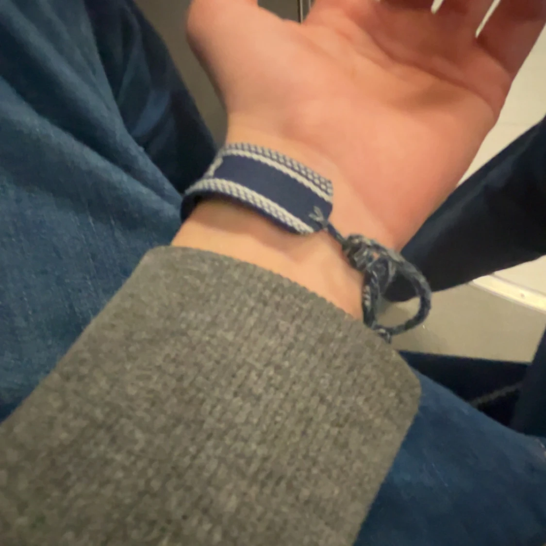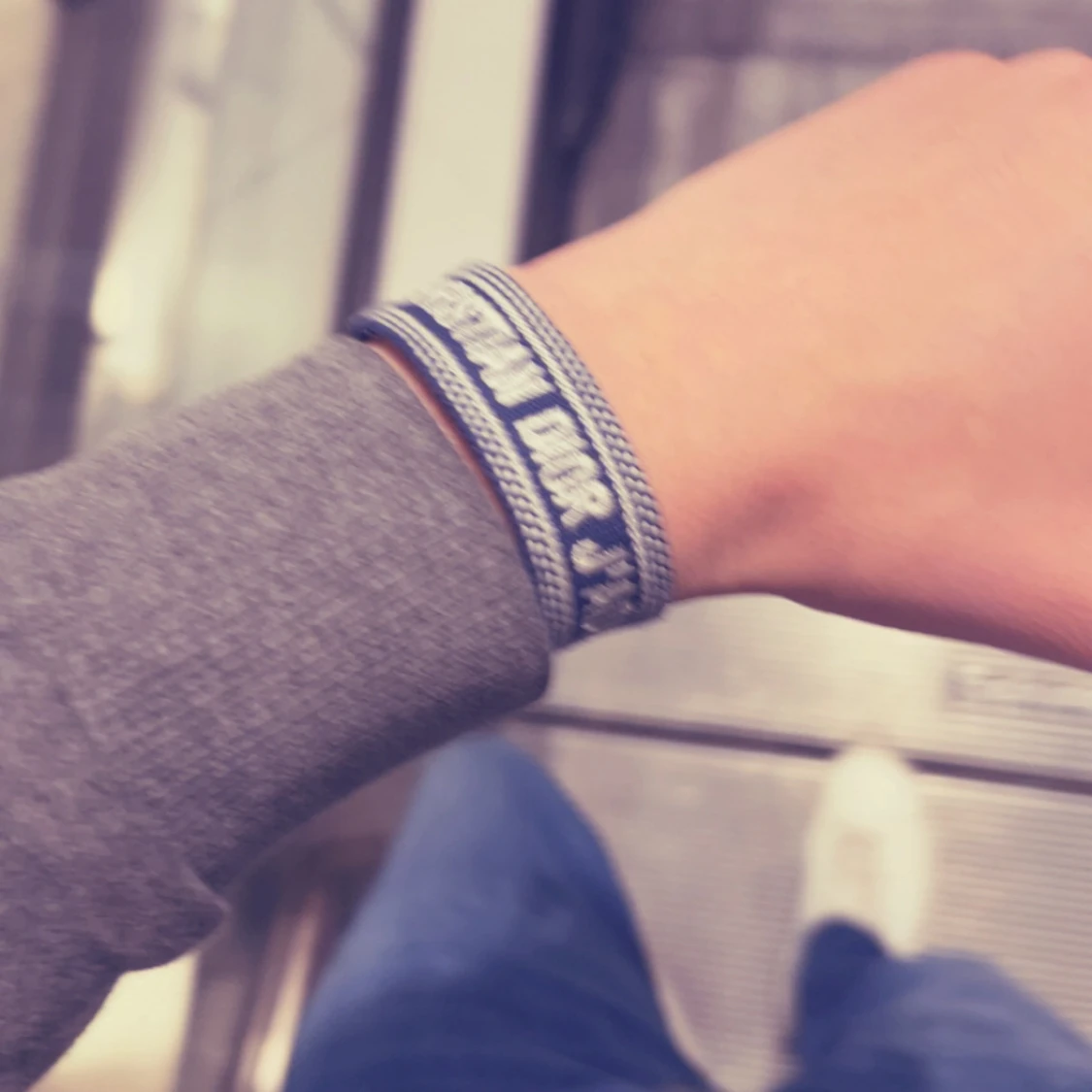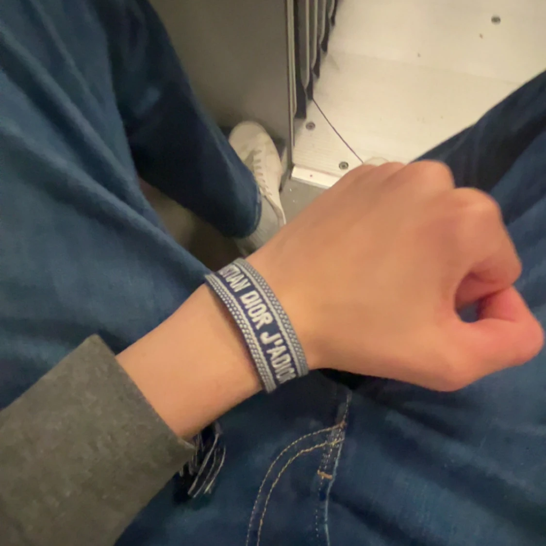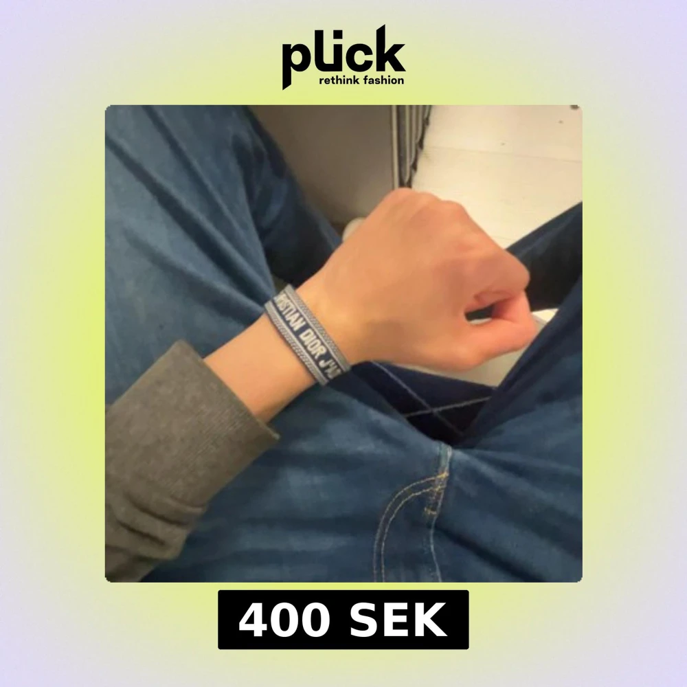 Snyggt blått tygarmband från Christian Dior med texten 'J'Adior' broderad i vitt. Armbandet har ett justerbart knytband och detaljerade kanter i vitt. Perfekt accessoar för dig som gillar exklusiva märken och vill sticka ut med en trendig look.