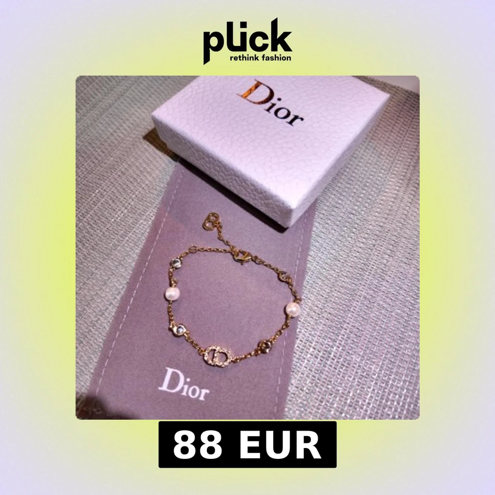 Lyxigt armband från Dior i guldton med kedja, dekorerat med vita pärlor och gnistrande kristaller. Armbandet har en ikonisk CD-logga i mitten med små stenar och en liten Dior-berlock vid låset. Perfekt för dig som vill ha något extra snyggt på handleden.