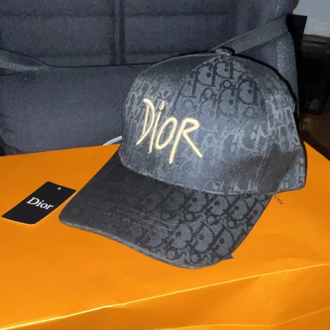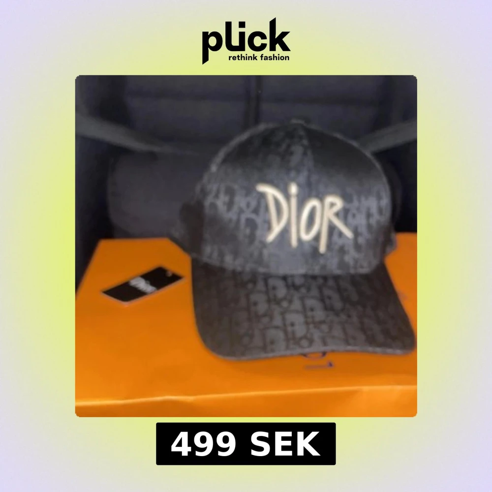 Snygg svart keps från Dior med ikoniskt logomönster över hela kepsen och broderad Dior-text framtill i beige. Klassisk böjd skärm och justerbar passform. Perfekt accessoar för att lyfta din streetwear-look.