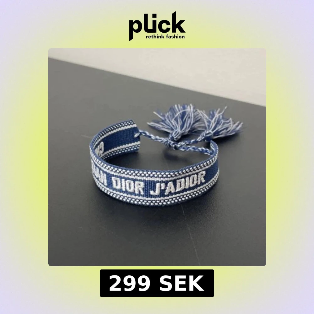 Snyggt blått armband från Christian Dior med texten 'J'ADIOR' broderad i vitt. Armbandet har justerbar knytning med tofsar i ändarna och är gjort i ett mjukt tygmaterial. Perfekt accessoar för att lyfta din outfit med en lyxig touch.
