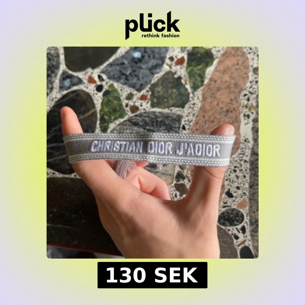 Snyggt grått armband från Christian Dior med broderad text 'J'Adior' i vitt. Armbandet har en mjuk, vävd design och avslutas med två stilrena tofsar. Perfekt accessoar för att lyfta din outfit med en lyxig touch.