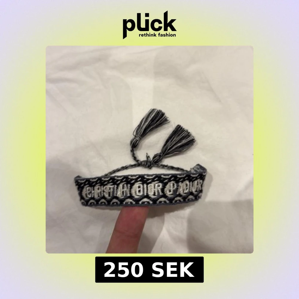 Snyggt armband från Christian Dior med texten 'J'Adior' broderad i vitt på svart bakgrund. Armbandet har justerbar knytning med tofsar i ändarna och ett diskret mönster längs hela bandet. Perfekt accessoar för att lyfta din outfit.