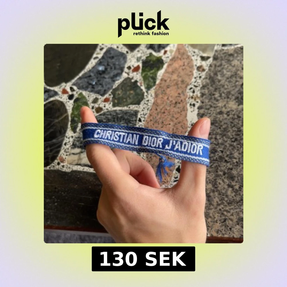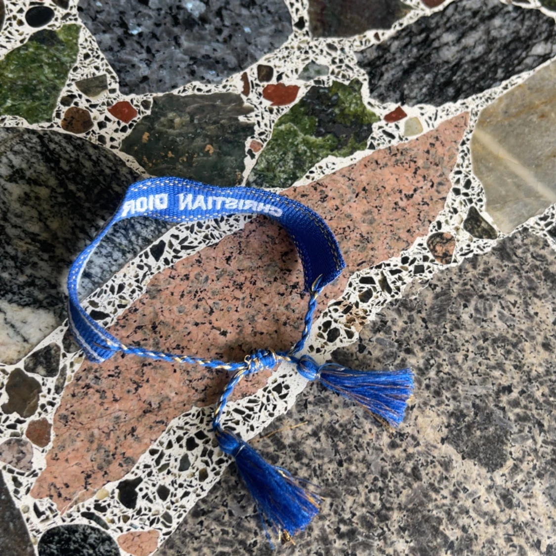 Snyggt blått armband från Christian Dior med texten 'J'Adior' broderad i vitt. Armbandet har justerbar knytning och två blå tofsar som detalj. Perfekt accessoar för att lyfta din outfit med lite lyxig vibe.