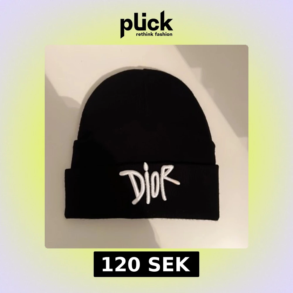 Svart mössa från Dior med vit broderad logga framtill i streetstyle-typsnitt. Klassisk uppvikt modell med diskret Dior-tag på sidan. Tillverkad i mjukt material som håller dig varm och snygg under kalla dagar. Knappt använd!