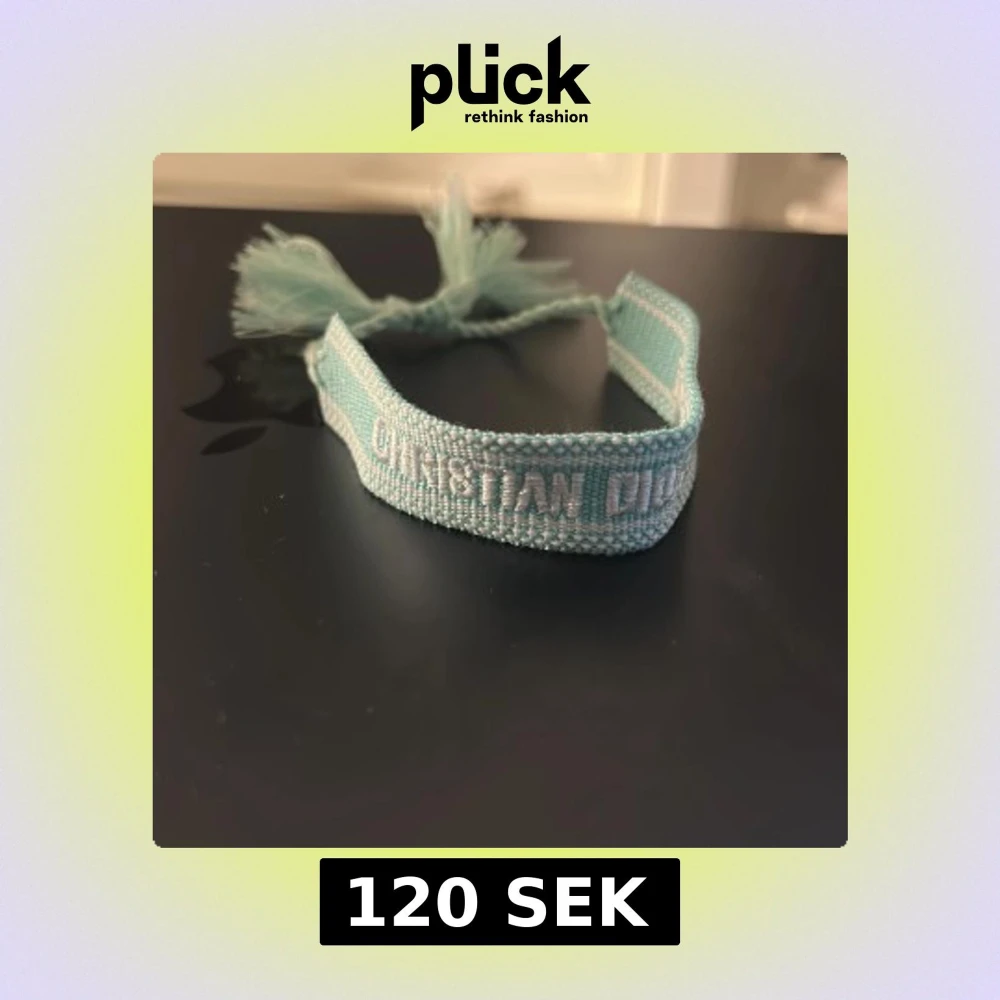 Snyggt turkost armband från Christian Dior med texten 'J'Adior' broderad i vitt. Armbandet är gjort i ett mjukt tygmaterial och har flätade snören med tofsar i ändarna för att knyta runt handleden. Perfekt accessoar för att lyfta din stil.