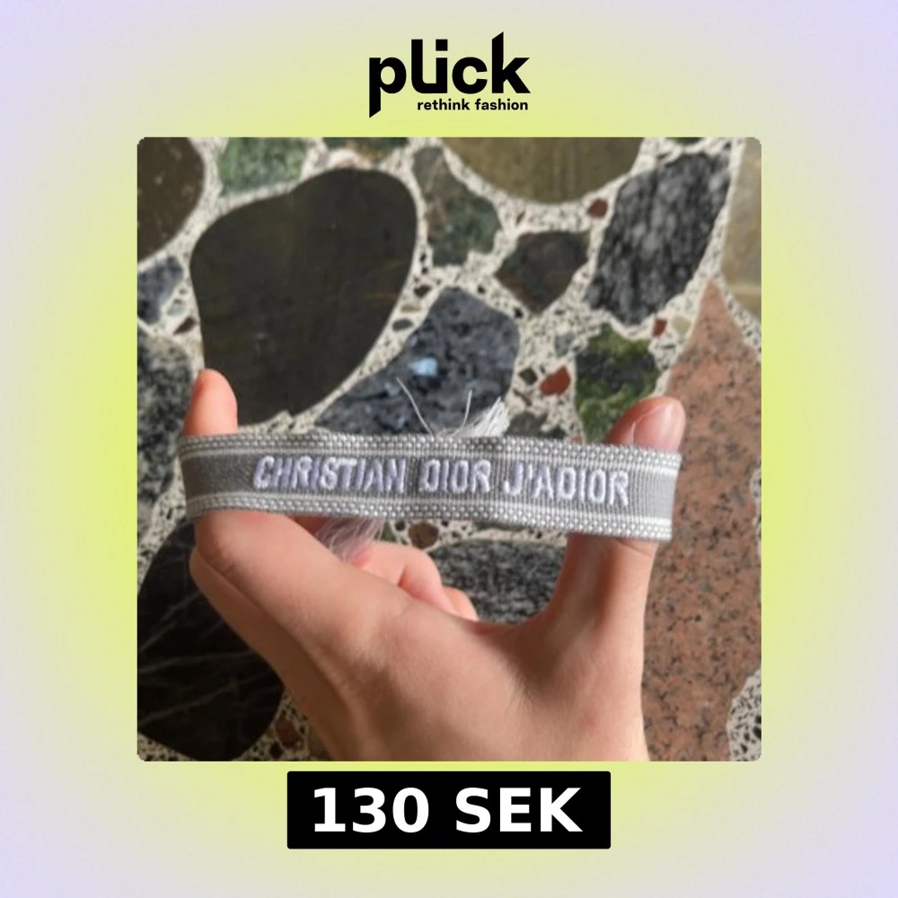 Snyggt armband från Christian Dior med broderad text 'J'Adior' i vitt på silvergrå bakgrund. Armbandet har justerbar knytning med två dekorativa tofsar i samma färg. Perfekt accessoar för att lyfta din stil.