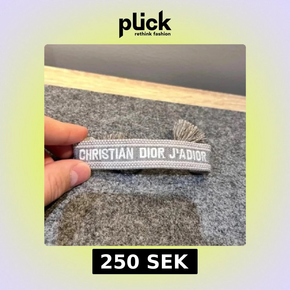 Snyggt grått armband från Christian Dior med texten 'J'Adior' broderad i vitt. Armbandet är vävt och har justerbara snören med tofsar i ändarna för en cool och avslappnad look. Perfekt accessoar för att lyfta din outfit med lite lyxig vibe.