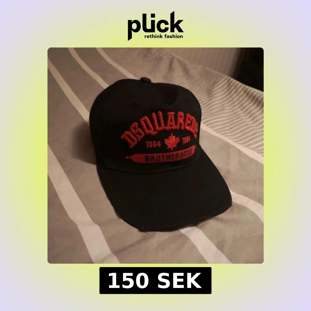Säljer en svart keps från Dsquared2 med röd brodyr framtill där det står 'DSQUARED2 Brotherhood' och årtal. Kepsen har justerbart spänne bak och texten 'DEAN-DAN CATEN' broderat i rött. Klassisk böjd skärm och cool streetstil.