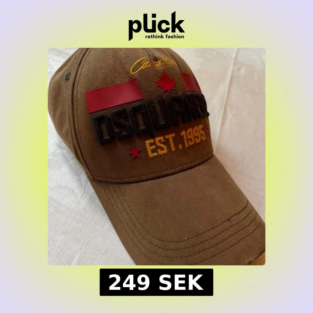 Säljer en brun keps från Dsquared2 med broderad text, röda detaljer och gul brodyr. Framsidan har tydlig Dsquared2-logga, kanadensiskt lönnlöv och EST. 1995 i gult. Kepsen har böjd skärm och klassisk passform. Perfekt för dig som vill sticka ut med en snygg accessoar.