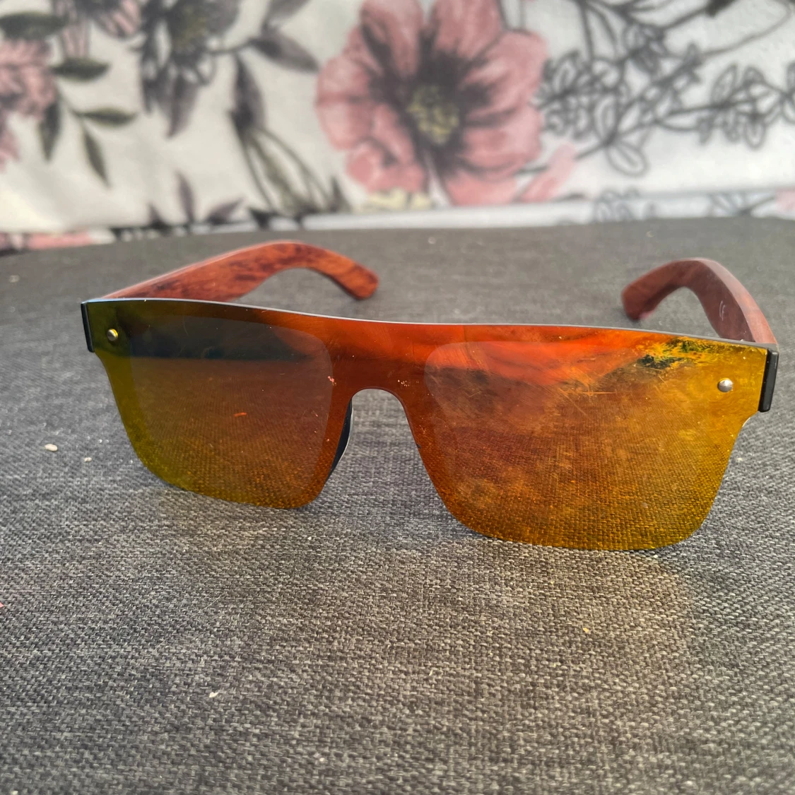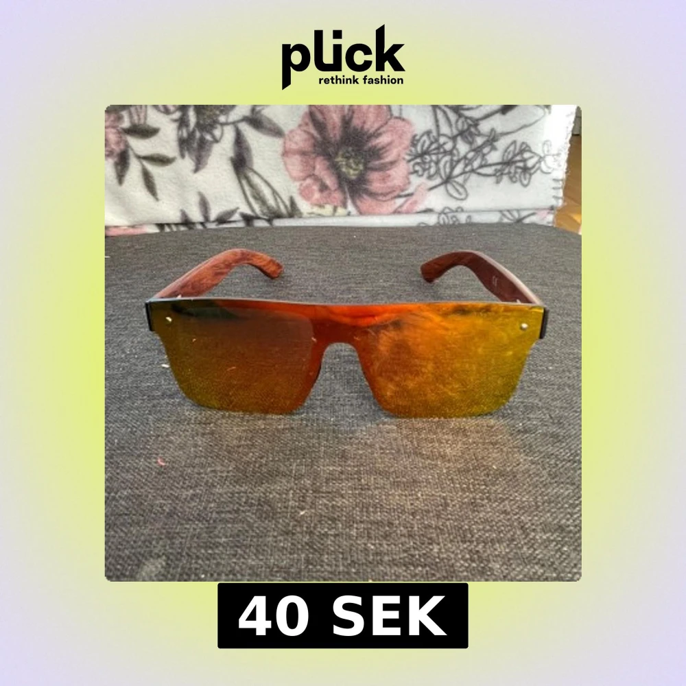 Säljer ett par feta solglasögon från Dubery med stora, rektangulära spegelglas i orange och gult. Skalmarna har trälook och loggan är ingraverad på sidan. Perfekt accessoar för dig som vill sticka ut med en modern vibe.