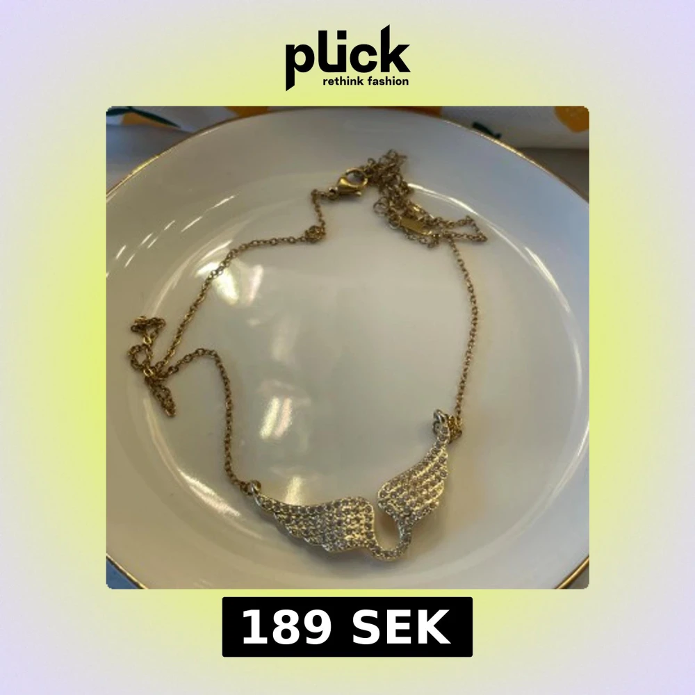 Snyggt halsband i guldton med ett hänge format som två vingar täckta av glittrande stenar. Kedjan är tunn och smidig, perfekt för att ge din outfit lite extra bling. Vingarna ger en cool och unik touch som verkligen sticker ut.