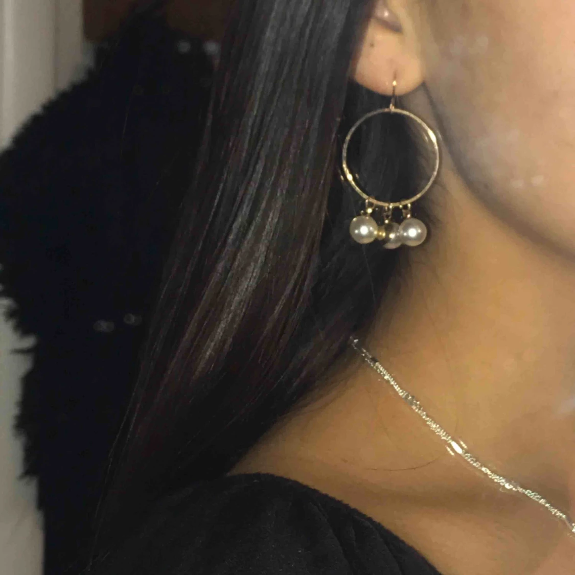 guldiga örhängen med tre pärlor i, kommer tyvärr inte till användning🥺💛