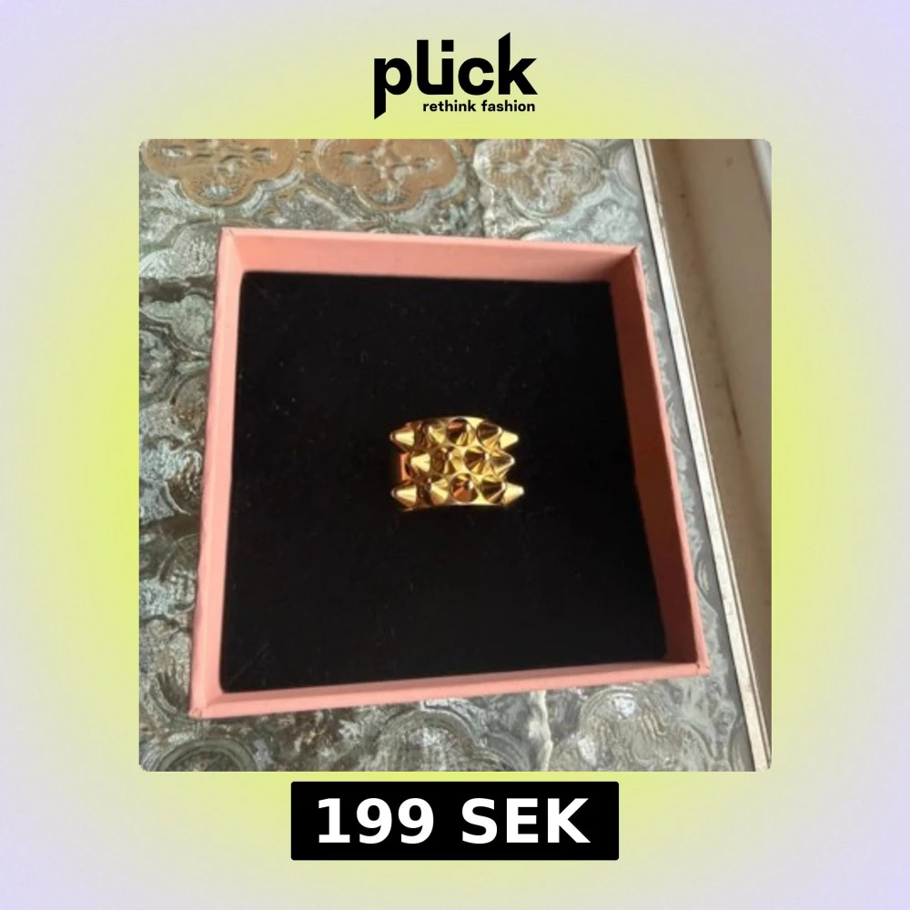 Säljer en cool och chunky ring från Edblad i guldtonad metall. Ringen har flera rader med pyramidformade nitar som ger en edgy och unik look. Perfekt för dig som gillar statement-smycken och vill sticka ut med din stil.