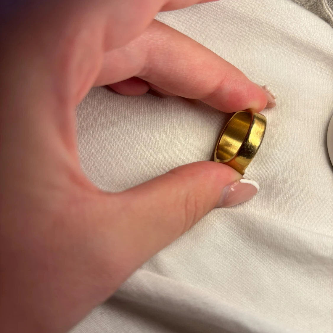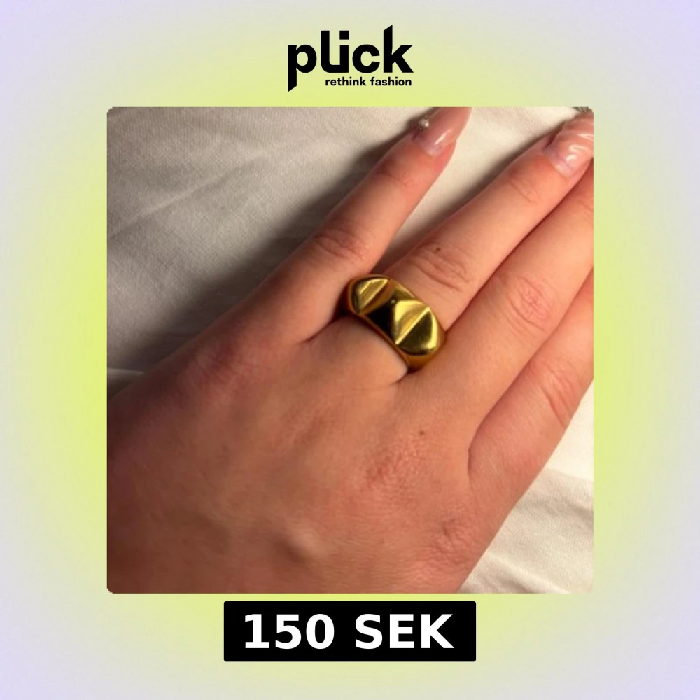 Säljer en chunky ring i guld med två coola pyramidformade detaljer på ovansidan. Ringen har en bred och blank yta som verkligen sticker ut och ger en edgy vibe. Perfekt för dig som gillar statement-smycken och vill ha något som syns.