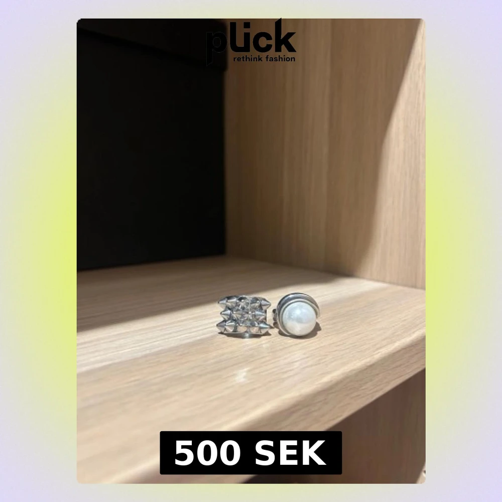 Två coola silverringar, en med ett geometriskt mönster av små pyramidformer och en med en stor vit pärla infattad i blankt silver. Perfekt för dig som gillar statement-smycken och vill sticka ut med din stil. Man får gärna köpa en av ringarna!