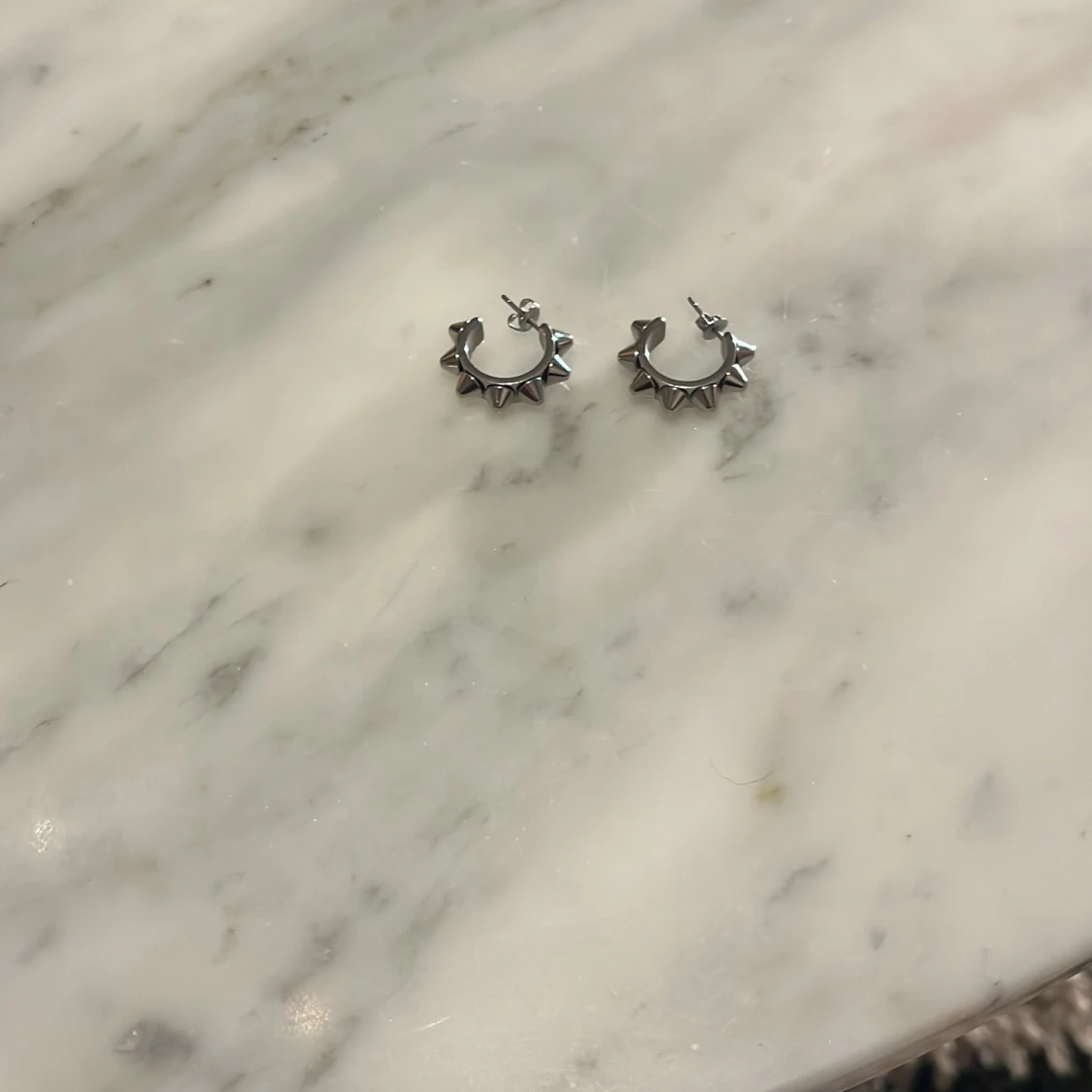 Snygga silvriga örhängen med coola nitar som ger en edgy look. Perfekta för att ge din outfit lite extra attityd. Lätta att bära och passar till många olika stilar.