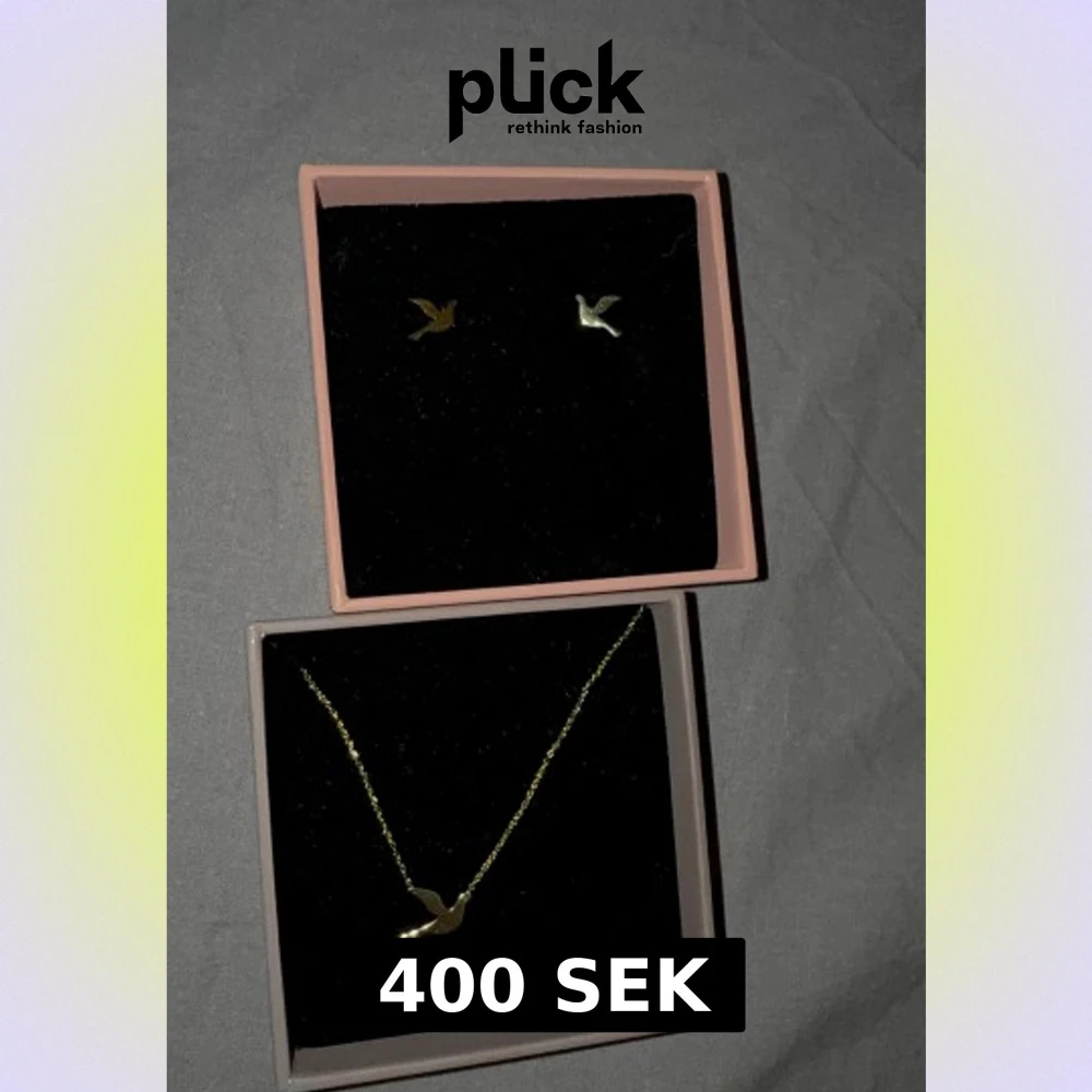 Säljer ett smyckeset med örhängen och halsband i guldton. Både örhängena och halsbandet har en stilren fågelformad design som ger en cool och unik touch. Perfekt för dig som gillar minimalistiska detaljer och djurmotiv. Fick i present men fall mig inte i smaken så dom är helt oanvända, ordinarie priset sammanlagt är 550❤️