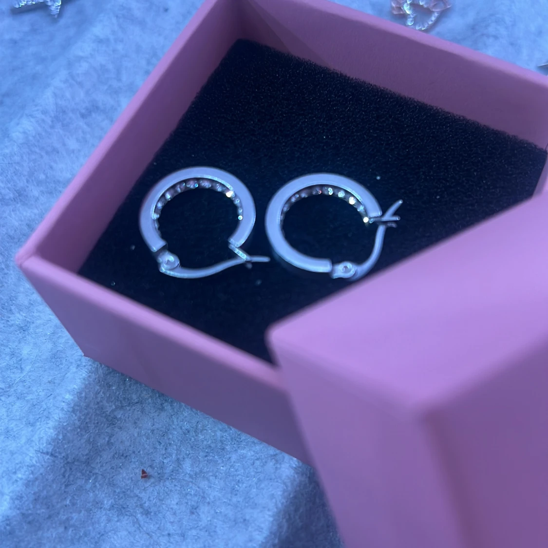 Snygga runda örhängen från Edblad i silverfärg med små gnistrande stenar längs insidan. Klassisk creolform som passar till allt och ger en stilren vibe. Kommer i original rosa ask från Edblad. Har aldrig använt örhängena, då jag föredrar guld istället!💕