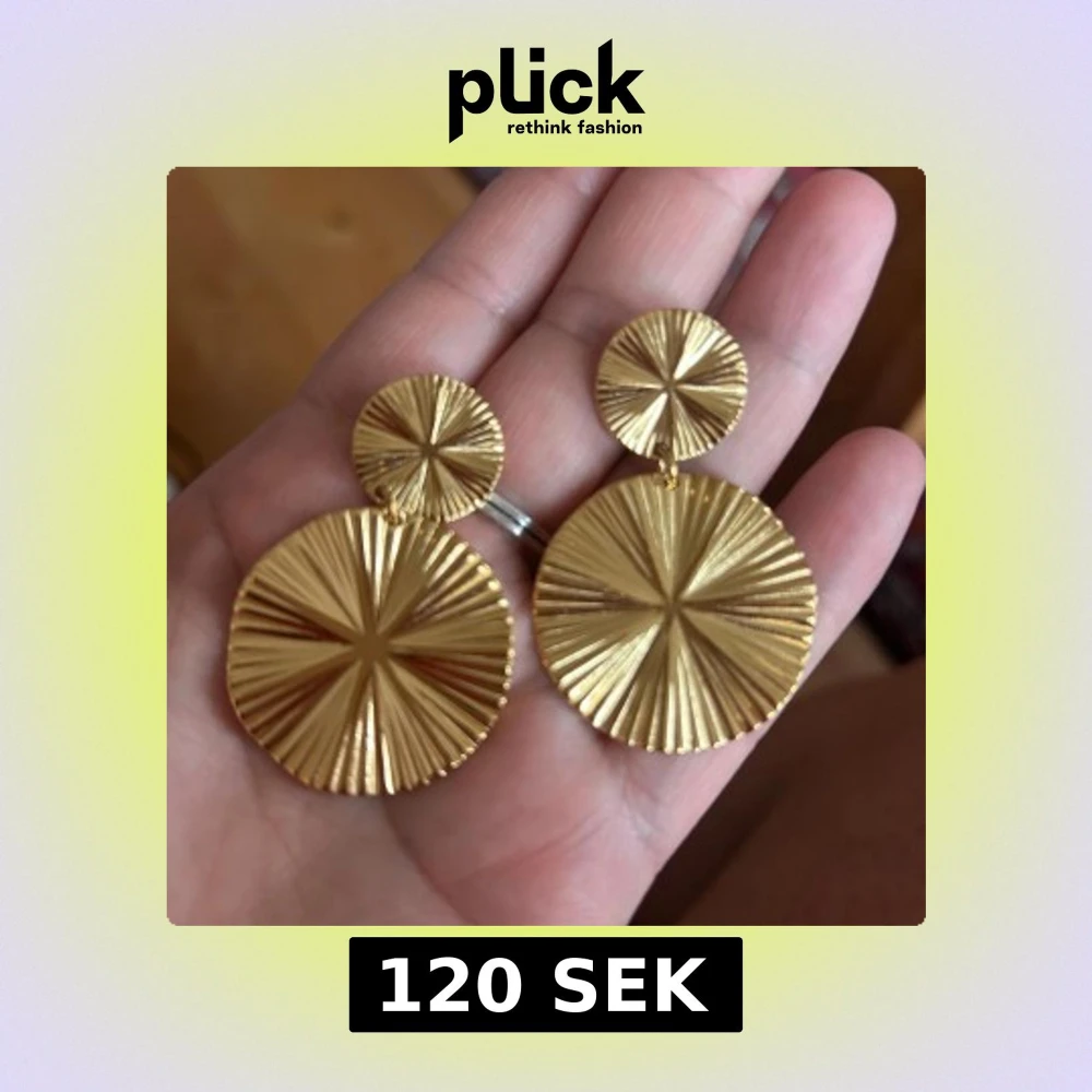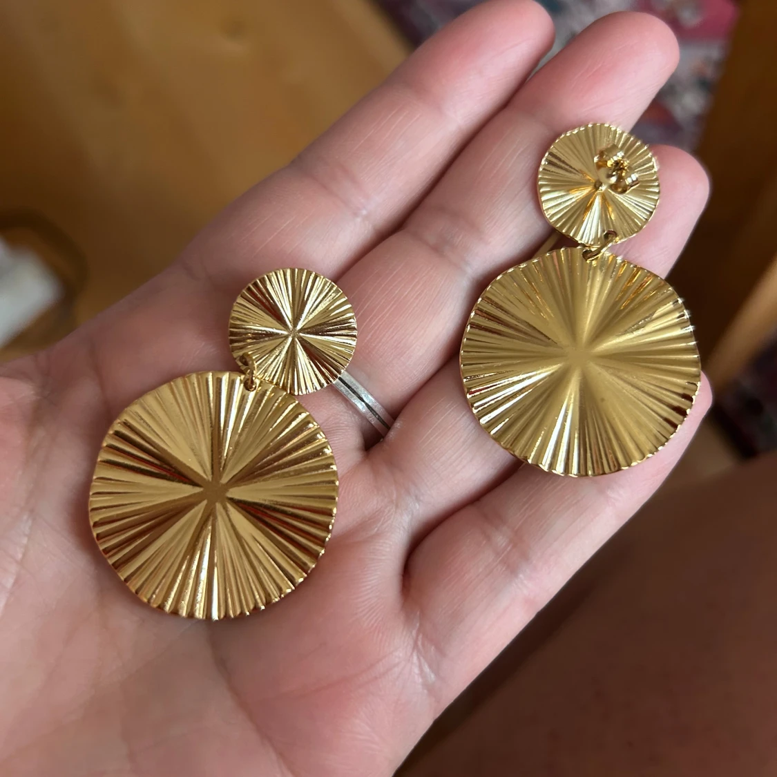 Säljer ett par runda statementörhängen i guld med snyggt räfflat solstrålemönster. Örhängena har två cirklar i olika storlekar som sitter ihop och ger en cool, iögonfallande look. Perfekta för dig som vill sticka ut och addera lite extra bling till din outfit. Dem liknar Caroline Svedbom örhängen modell Melia