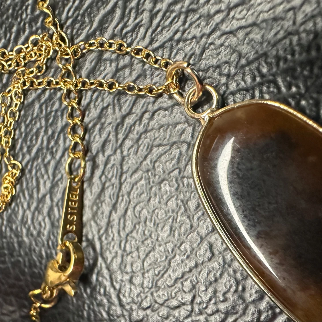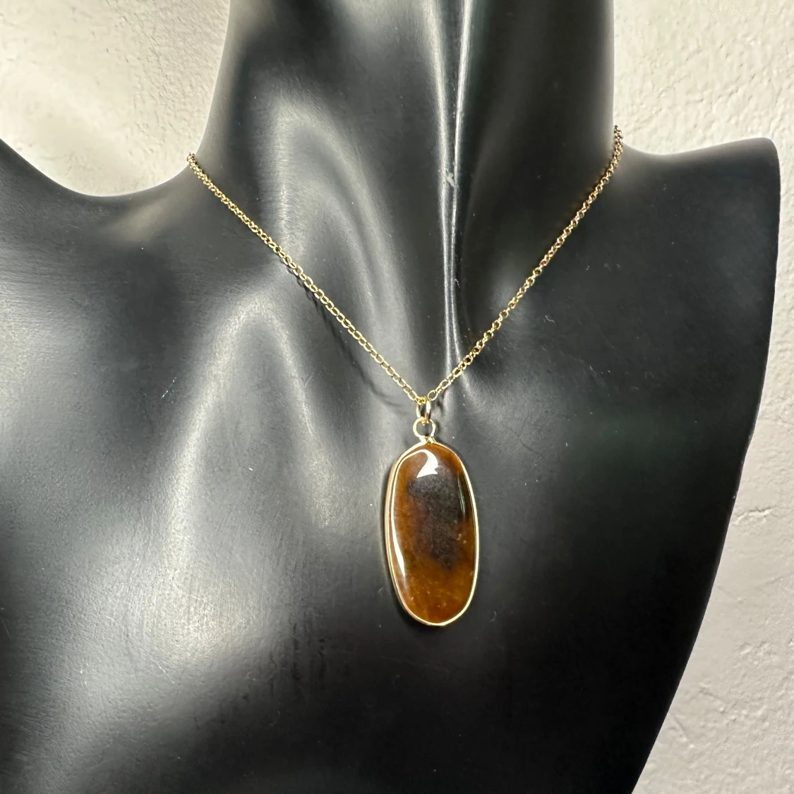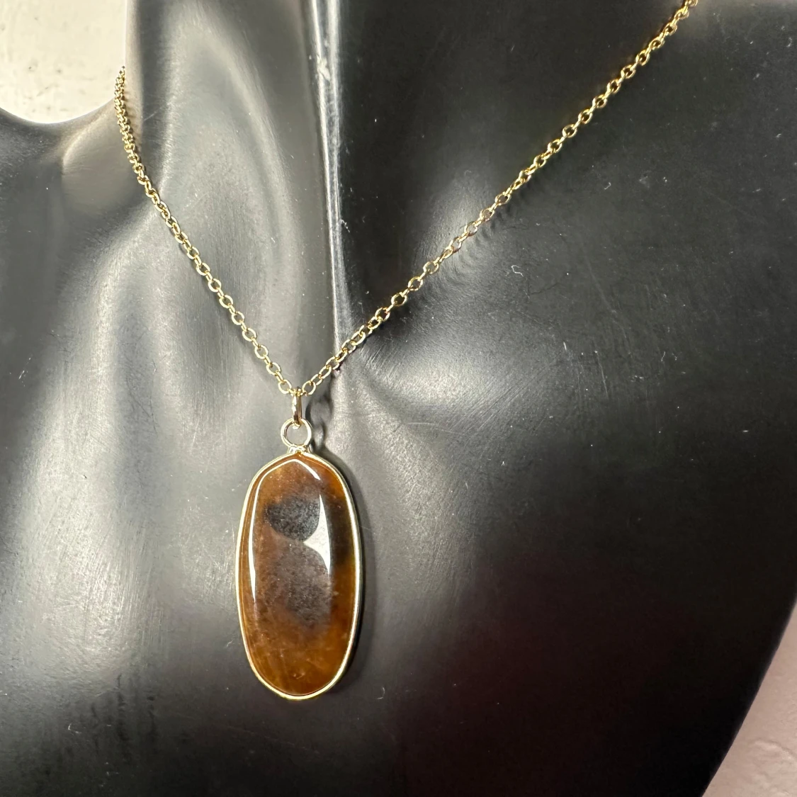 Oanvänt halsband med ett skimrande hänge i äkta tigeröga, infattat i guldfärgad metall. Stenen skiftar vackert mellan bruna och gyllene toner. Kedjan är i guldfärgat rostfritt stål (märkt S. STEEL), hållbar och allergivänlig. Tigeröga sägs vara en skyddande sten som stärker mod, fokus och inre balans – ett perfekt smycke både till vardag och fest. Kedjan är ca 45 + 5 cm, hänget ca 4,5 cm. Prutning accepteras ej, men jag erbjuder rabatt vid köp av flera saker. Kolla gärna på mina andra annonser!