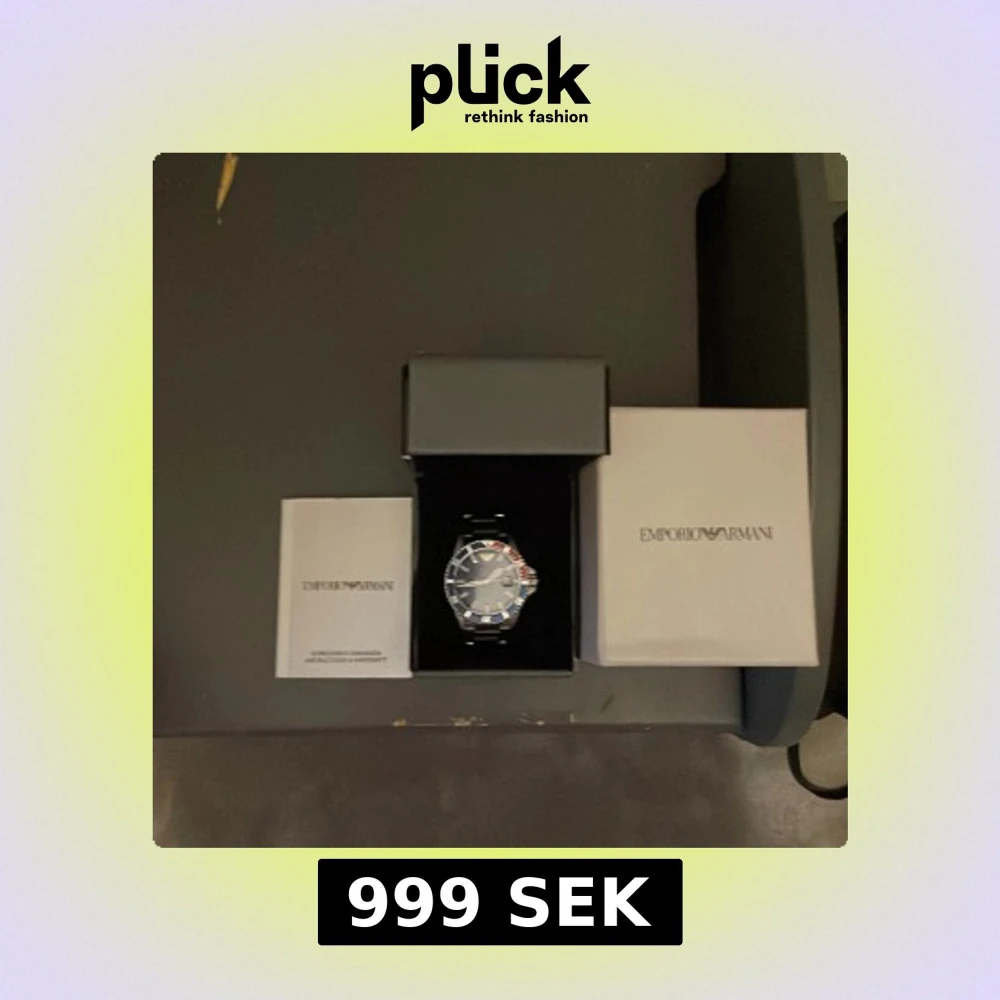 Stilren klocka från Emporio Armani med silverfärgad länk i metall och mörkblå urtavla. Ringen runt urtavlan är blå och röd, och klockan har tydliga index samt datumvisning. Säljes med originalask och manual. Ny pris cirka 3000kr, säljes pågrund av behöver pengar till moped 😁