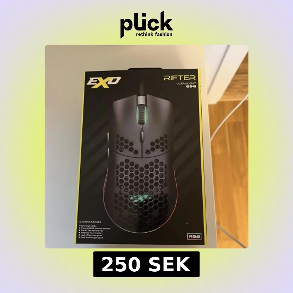 Säljer en EXO Rifter Ultralight gamingmus som väger endast 69g. Musen har en stilren svart design med ett unikt hexagonmönster för ventilation och RGB-belysning som kan anpassas. Perfekt för snabba rörelser och precision i spel.